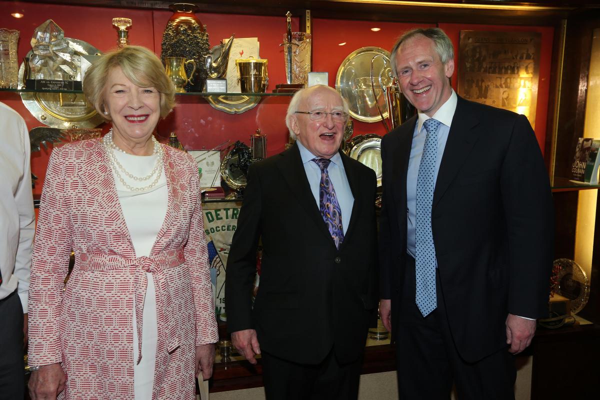 The guests visited the Oval Boardroom where they signed the club guestbook and were photographed with the Vienna Cup, the first European club tournament won by Glentoran immediately prior to the outbreak of World War One in 1914. Pictured below are President and Mrs Higgins meeting Paul McLean of Bet McLean, principal sponsor of Glentoran Football Club.
