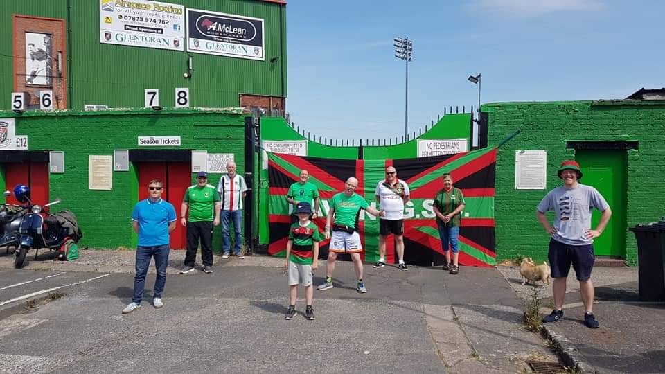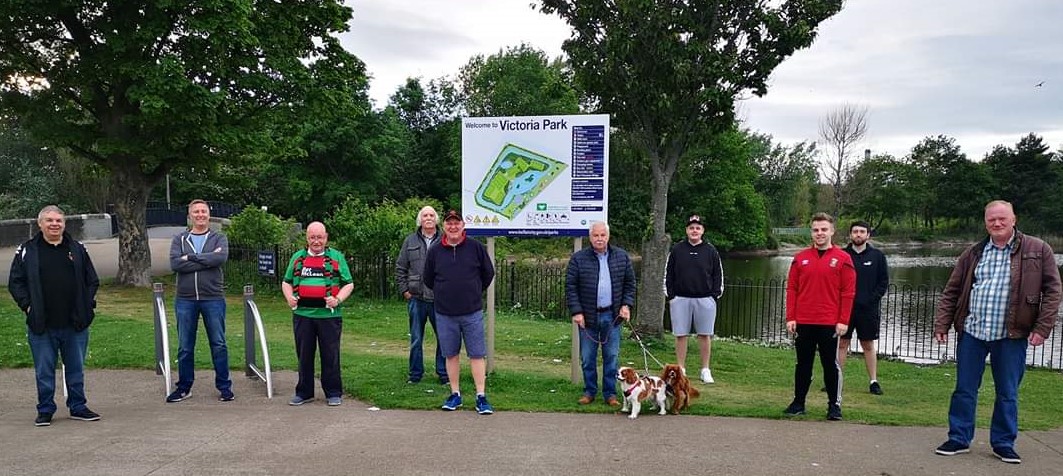 Ballymac Family & Friends (including First East Belfast GSC) hiked in socially distanced groups of six from the clubrooms in Wilgar Street,Along the Holywood Road, Sydenham By-Pass, stopping at the Oval for photos, then back to Wilgar Street.They were led by Glentoran Legends Elliott Morris and Paul Leeman, plus groundsman William Kirkwood. They were welcomed to the Oval by double winning Glens manager Tommy Jackson. This raised £500.
