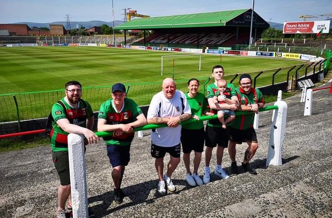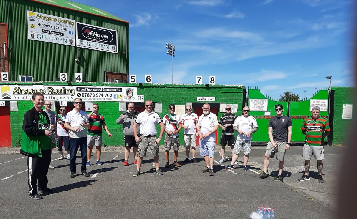 A group of independent Glens season ticket holders from Rathcoole, hiked the ten miles from Rathcoole to the Oval and back, raising £265. They are photographed here at the barrier on the Sydenham End where they stand each home match.