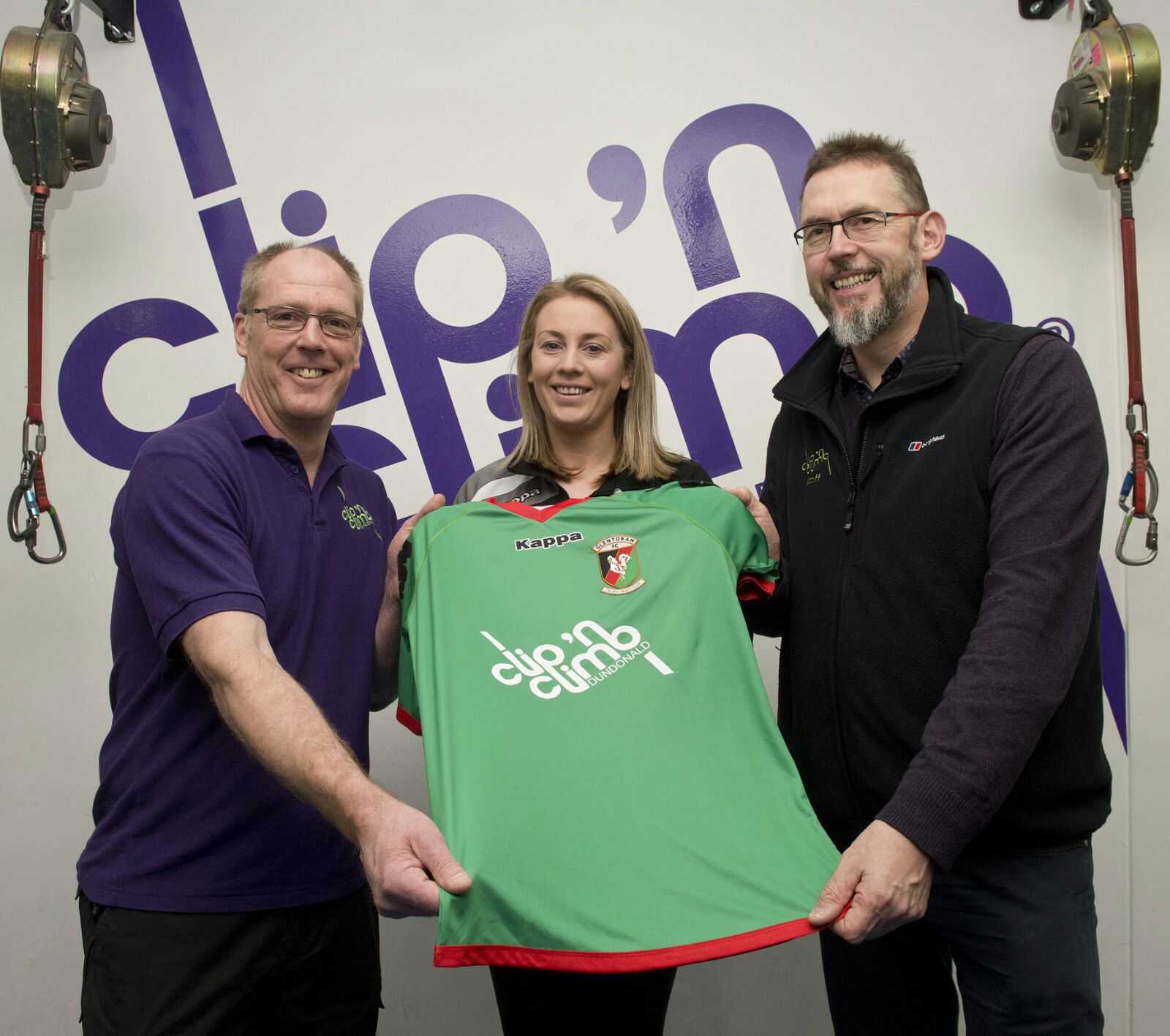 The new playing kit for Glentoran Belfast United U15 girls was presented to Suzie Baxter, team manager by Clip 'n Climb Director Stephen Dickson and General Manager Tony Marshall