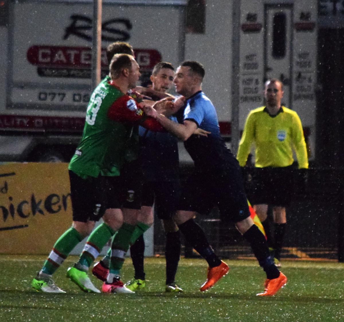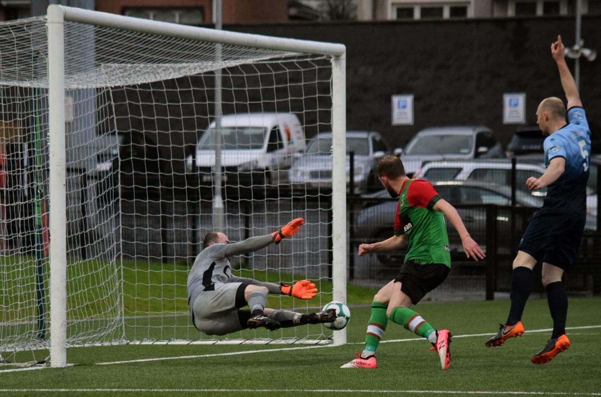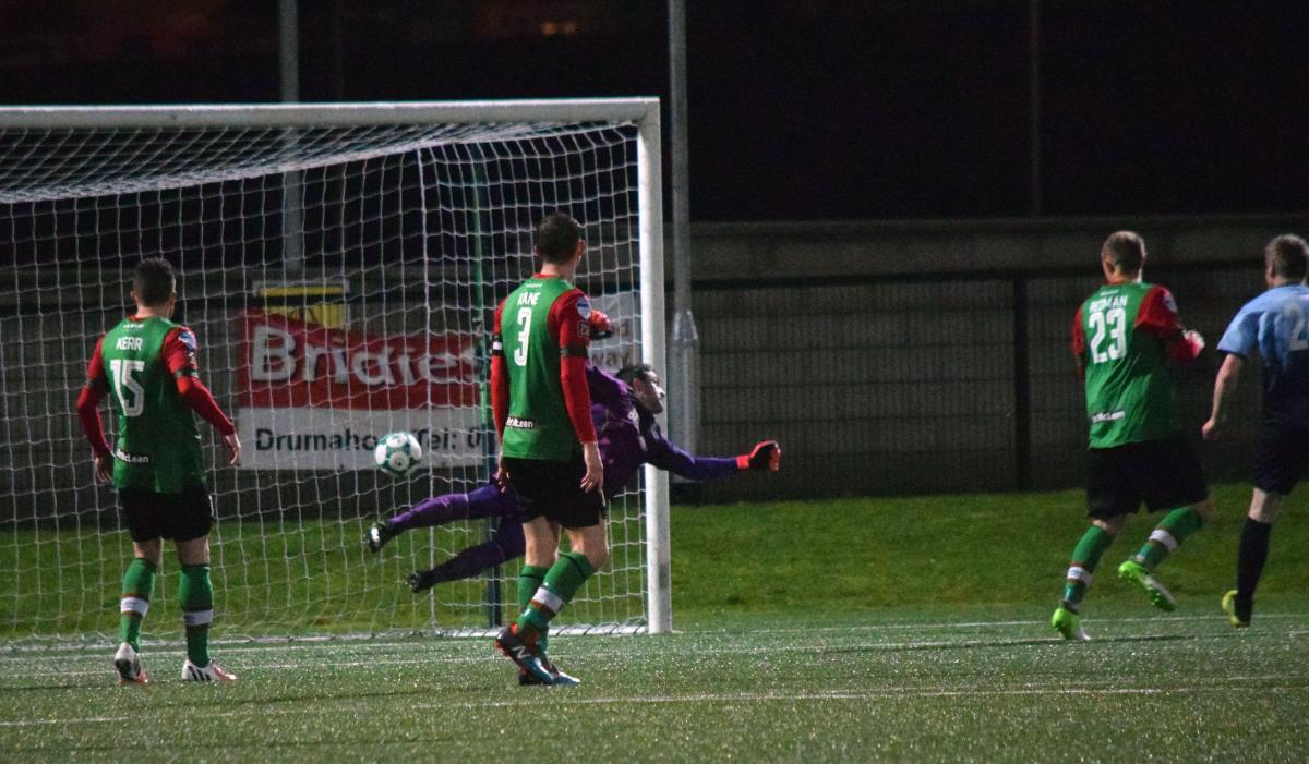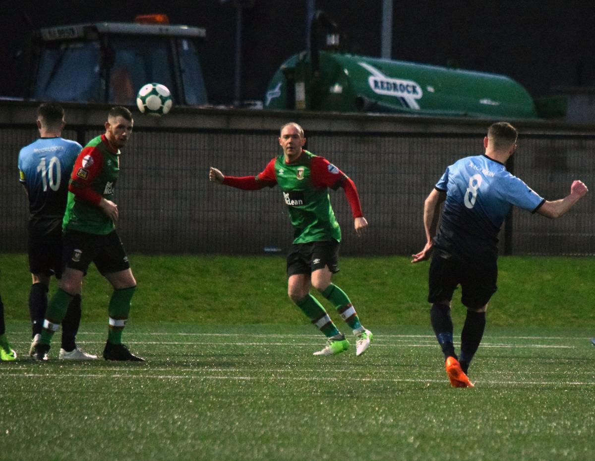 Still without any substitutions made, we continued to attack and on 71 minutes former Cliftonville player Caoimhin Bonnar was finally booked for one foul too many on McDaid. The resultant free kick was headed over by Stevie Gordon. Institute then made the first substitution of the match as they moved to three at the back with former Glens striker Darren Henderson replacing Mark Scoltock. However it was the Glens who next created a chance when Peter McMahon had a weak attempt from a good shooting position.