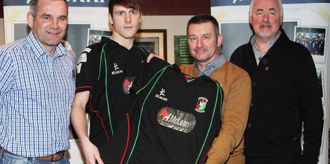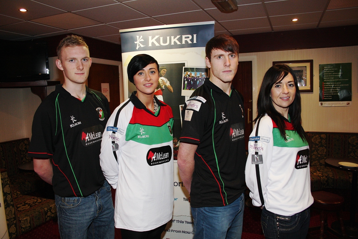 Stevie Gordon, Claire Rea, Willie Garrett and Lyndsey Corry in the 2012-13 home and away shirts.