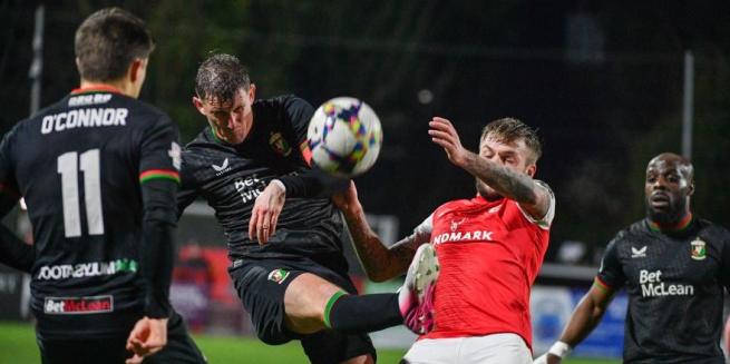 With Paddy McClean still injured, Warren Feeney started with the same 11 that defeated Newry last week. From the outset Larne showed areal urgency and combativeness on and off the ball with Lee Bonis hitting the bar on 9 minutes and Seanan Clucas blocking a shot from Larne’s Mexican midfielder Jaziel Orozco 2 minutes later.