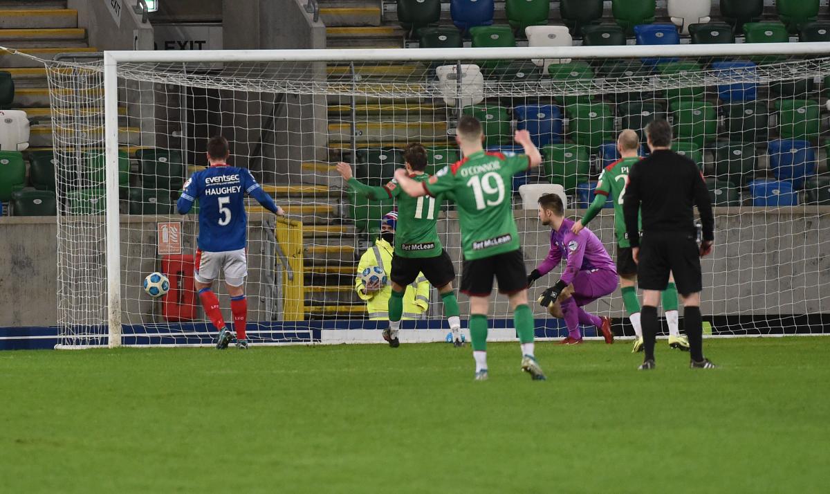The first 20 minutes were relatively uneventful with the only issues of note being a header clear by Marron from a deep cross by former Glenman Jordan Stewart, a blocked shot from Conor McMenamin after a mazy run when sent clear by Jay Donnelly, and a blast over the bar from Linfield skipper Jamie Mulgrew after a nice Linfield move involving four players.