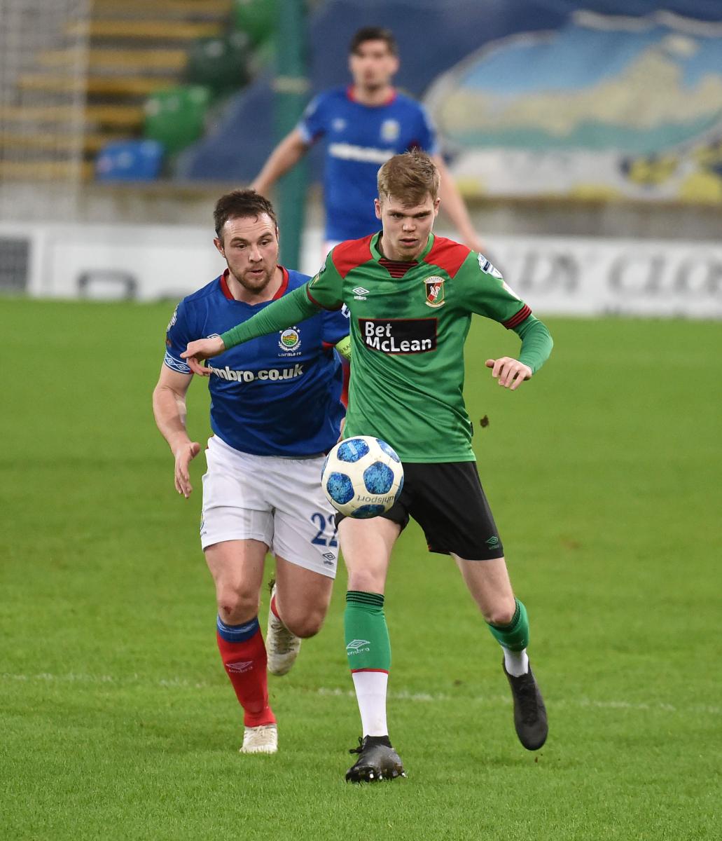 The substitutions weren’t finished as after 65 minutes the dangerous Kirk Millar replaced the anonymous Navid Nasseri on the Linfield wing, and with 10 minutes left, Rory Donnelly replaced his brother Jay at centre forward for the Glens. The younger Donnelly had worked tirelessly and effectively throughout, and just before his departure brought good saves from Johns after wonderful runs from O’Connor and Marshall respectively. The Blues keeper also had to be on form to make a save from a Conor McMenamin snap shot.