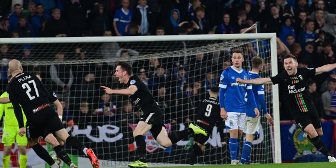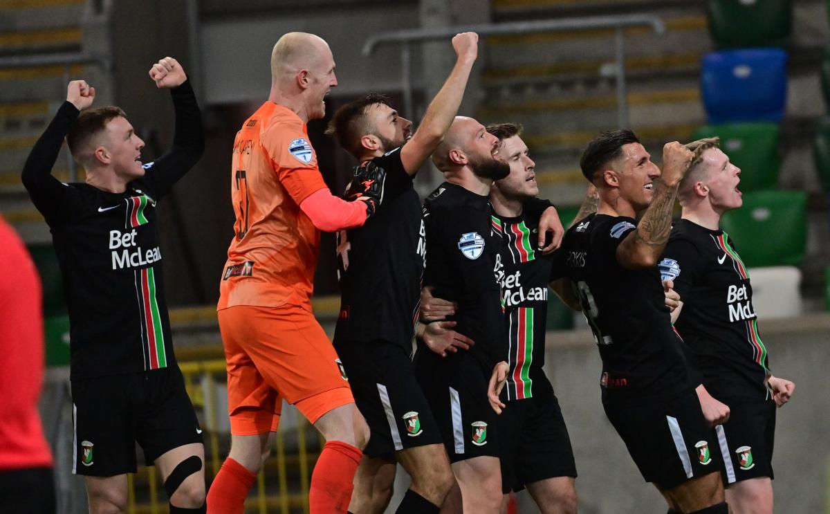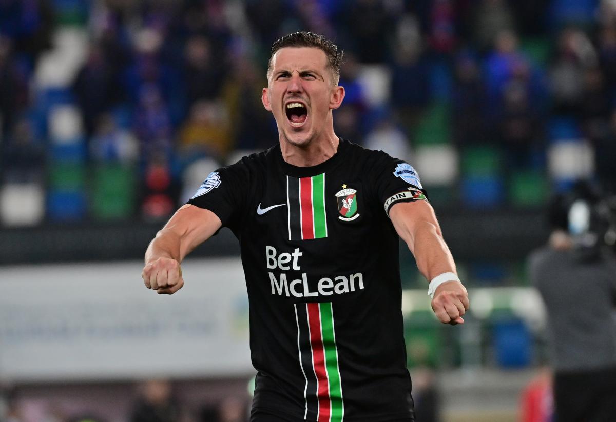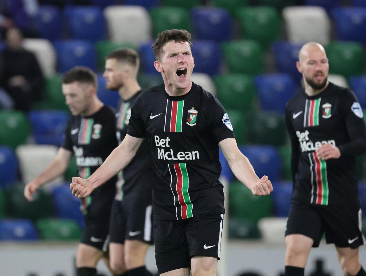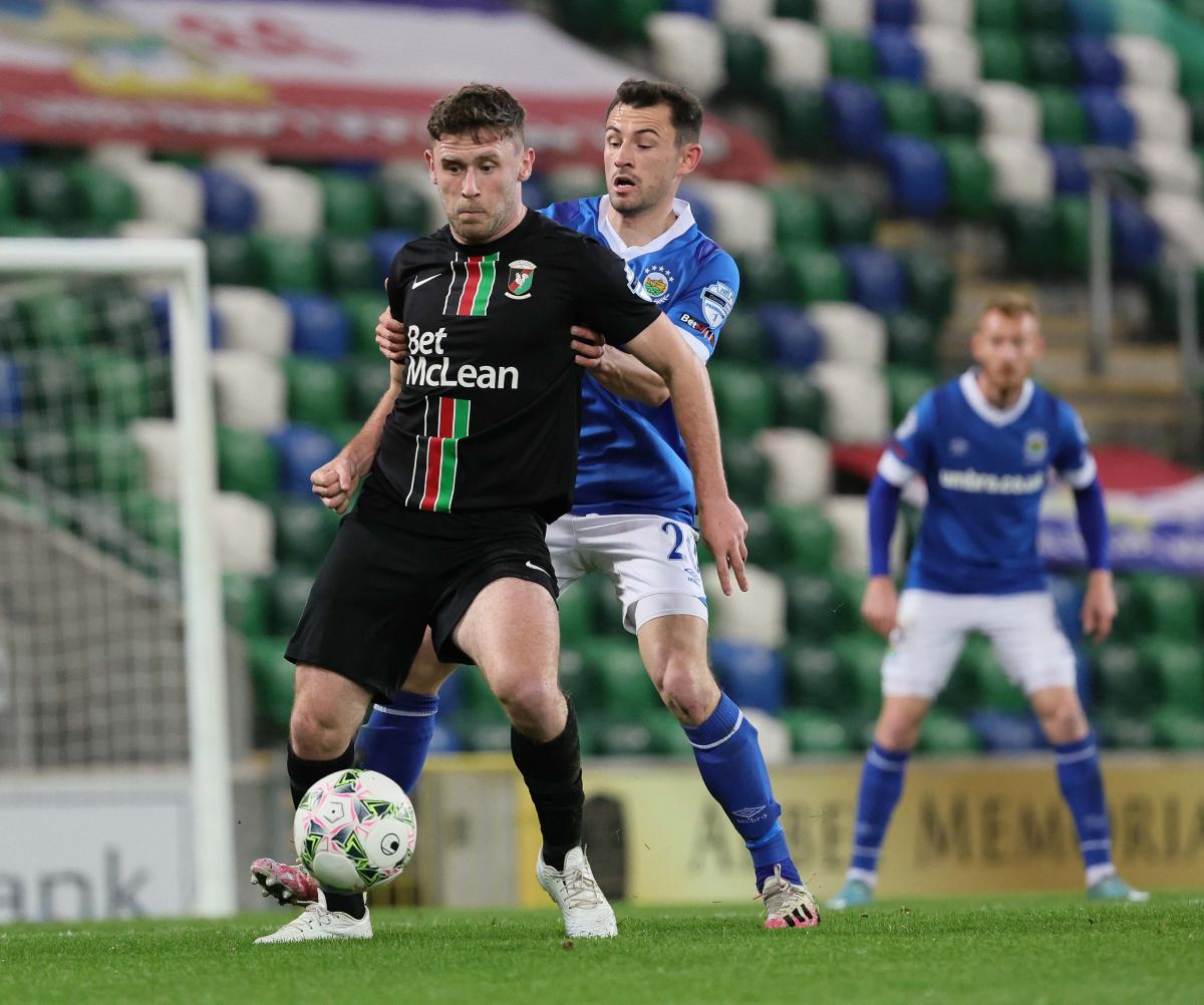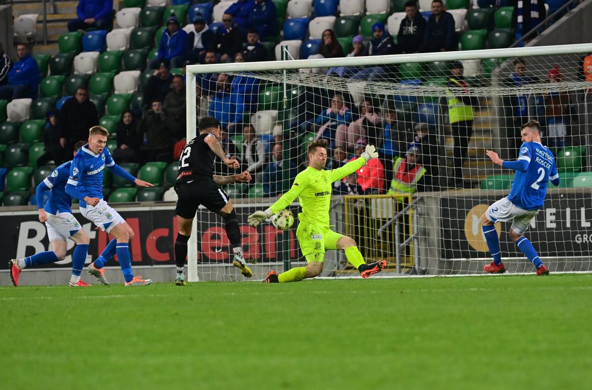 The Glens started the game in a very attacking manner but it had begun in a controversial manner with Linfield’s Kyle McLean booked for a vicious lunge at Marcus Kane. McClean can consider himself very lucky to have stayed on the pitch. Then six minutes later – after Shay McCartan and Rhys Marshall had each stretched the Blues’ defence from the right – McCartan was controversially booked for simulation when he went down in the Linfield box.