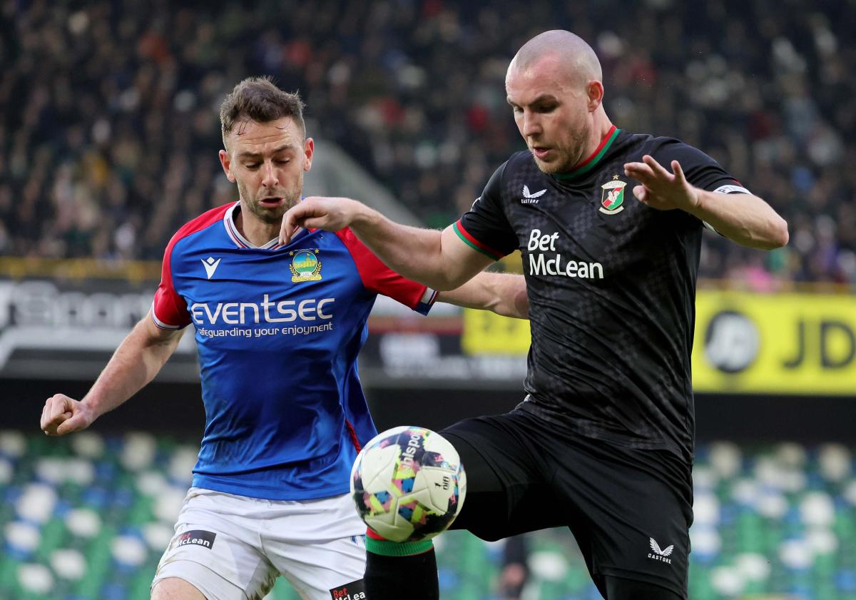 The first major talking point came on 27 minutes when Linfield were awarded a penalty. Aaron McCarey needed to impede Fitzpatrick after spilling a Linfield cross. However the Glens keeper immediately redeemed himself, making a brilliant stretching save from Rhys Annett’s subsequent penalty. Shortly afterwards the Glens could have taken the lead but Paddy McClean struck just wide from an O’Connor free.