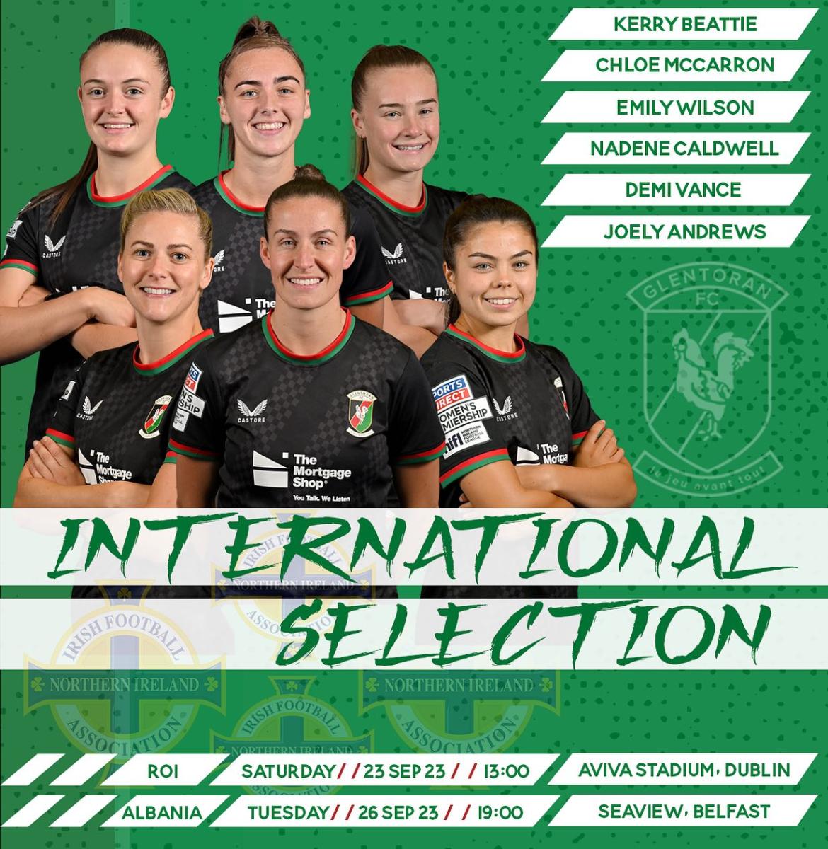 Maeve McConaghy, Rebecca Magee, Rachel McIntyre, Kascie Weir, Megan Neill, Sarah Tweedie and goalkeeper Ellie Scott have all been called up to represent Northern Ireland at U19 level in an international friendly against the Republic of Ireland on Sunday 24th September. With the game being held in East Belfast at the Blanchflower Stadium it’s hoped an equally strong Glentoran contingent will be supporting from the stands.