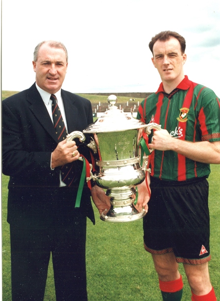 The final itself was the typical anti-climax. Regular left back Michael Smyth was injured and replaced by Darren Finlay but otherwise it was a full-strength team with Coyle strangely seeming to have been given a man marking role on ex-Celtic midfielder Tony Shepherd. The Glens never looked in trouble against a strong Glenavon attack, but it took a solo 25 yard wonder goal on the 75th minute from Glenn Little to clinch it 1v0 Our seventh cup 11 years and one that encouraged Tommy Cassidy to say we had the makings of a squad that could dominate local football for a decade.