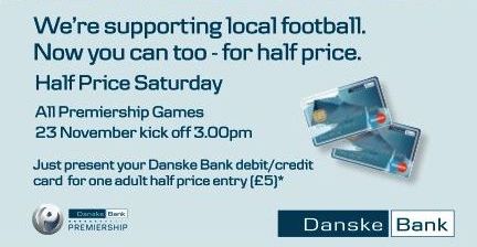 Danske Bank is teaming up with the 12 Irish Premier League teams to offer a great deal to football fans who bank with Danske Bank. Anyone who presents a Danske Bank credit or debit card at the gate at any of the six Premiership games taking place on Saturday 23rd November will gain entry to the match for half-price (£5).