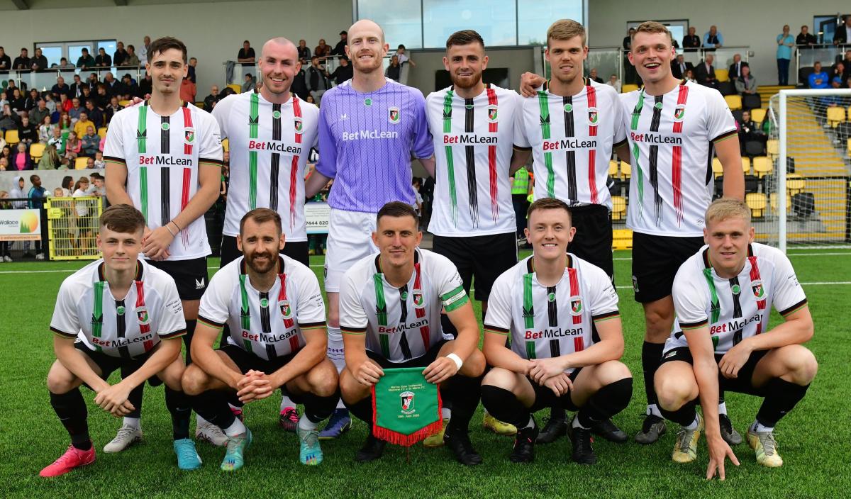 Early in the game a superb cross-field pass from Aaron Wightman found Rhys Walsh on the left flank. His cross into the area though was well defended by Declan Gallagher. On 13 minutes ‘Man-of-the-Match’ Aaron Wightman collected the ball from Luke McCullough and drove into the opposition half before playing a neat one-two with Rory Donnelly. Wightman went for goal from the edge of the area but his effort was well kept out by Zach Hemming in the visitors’ goal. A long ball forward from James Singleton was well gathered by Jay Donnelly but the Glentoran number 9 was crudely taken down by Gallagher. Donnelly carried on for a couple of minutes but had then to be replaced by Junior.