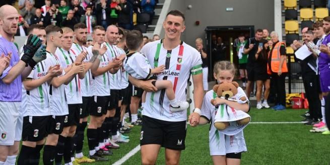 There was an excellent turn out and a festive atmosphere at the Blanchflower Stadium on Wednesday evening for Marcus Kane’s testimonial game against Scottish Premiership side, St. Mirren. Players and officials from both sides provided a guard of honour for the Glentoran skipper as he entered the field of play with his daughter Mollie at his side and son Bowie in his arms.