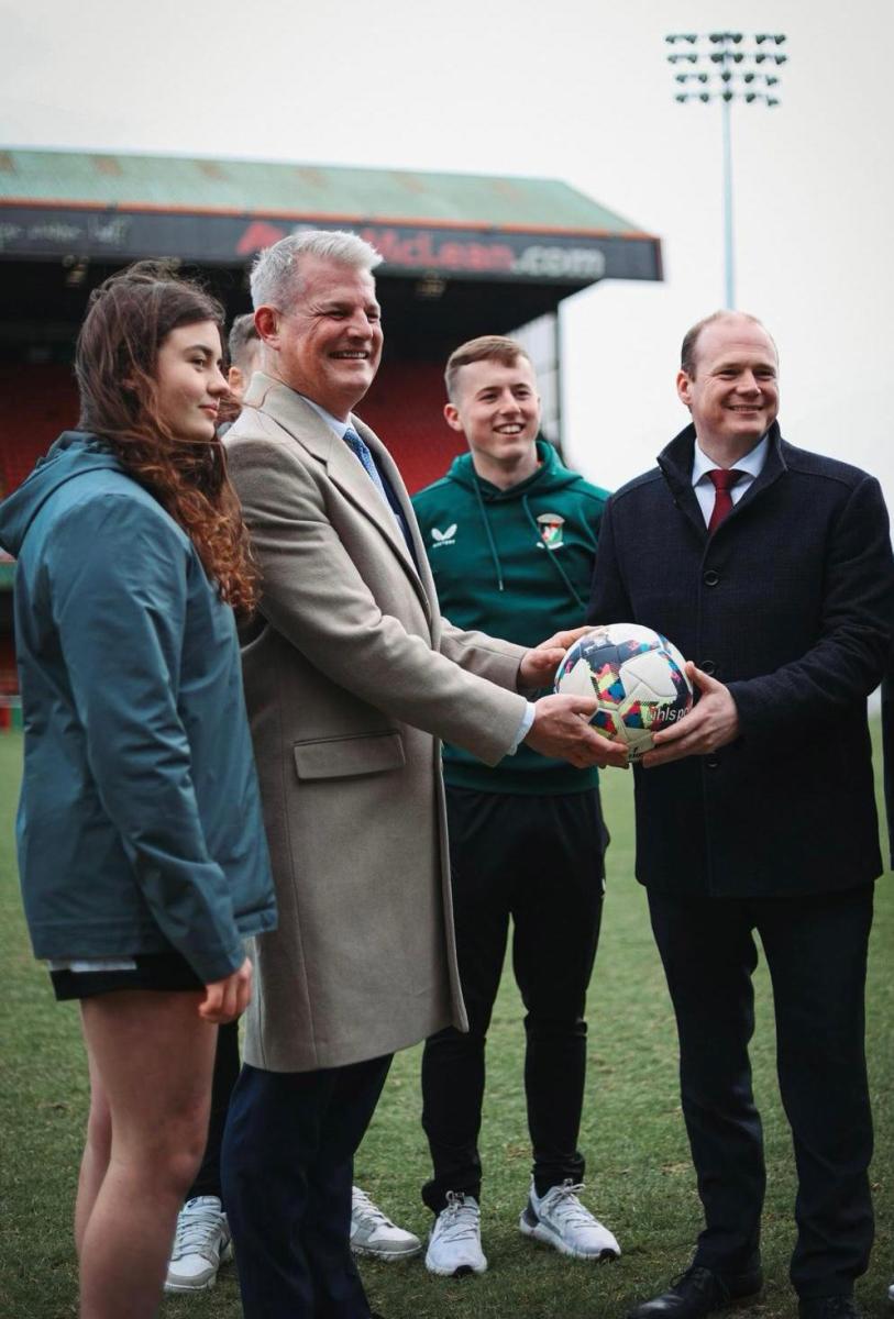 Included in this phottograph with both Ministers are Callan Farley (Glentoran Seconds player and a student in the Glentoran Boys Scholarship Programme) and Tally Hines (a Girls Academy player and student in the Glentoran Girls Scholarship Programme).