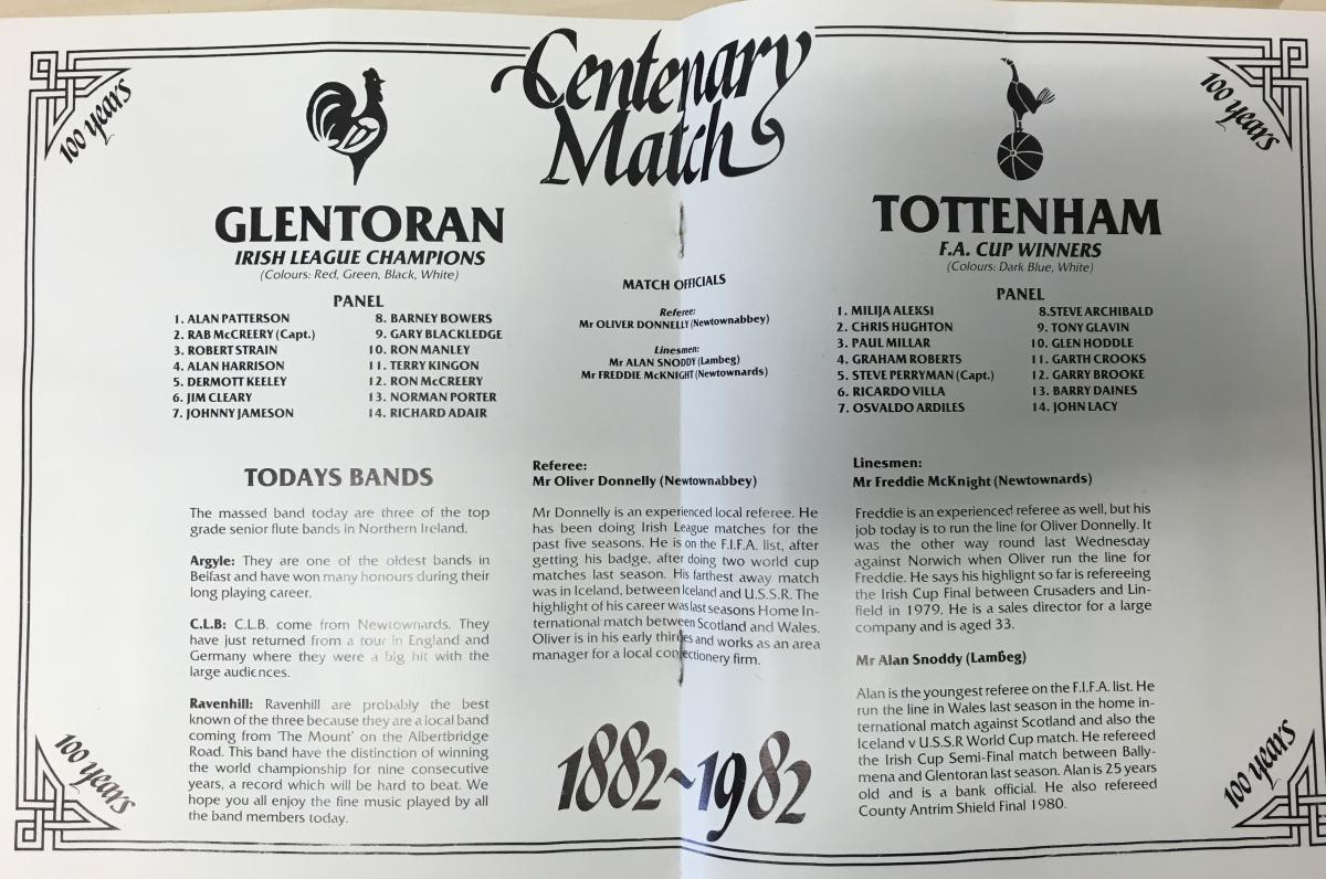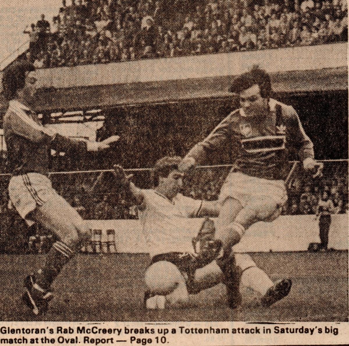 ‘A match of high drama, superb entertainment – a real battle of the Cockerels and the ‘Cock and Hens’. It ebbed and flowed in bewildering fashion. Glentoran led 1 – 0 at half-time. Terry Kingon scored after fifteen minutes when Johnny Jameson’s corner floated across for him send the ball into the roof of the net from 12 yards. They were in front, too, not by luck but by sheer skill, tactical know-how and they more than measured up in pace and stamina as well. Then there was tragedy in the 50th minute when the Glens conceded a penalty by bringing down Steve Perryman and from the spot Glenn Hoddle scored.
