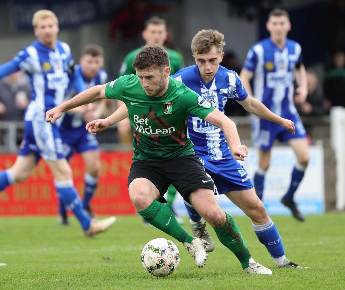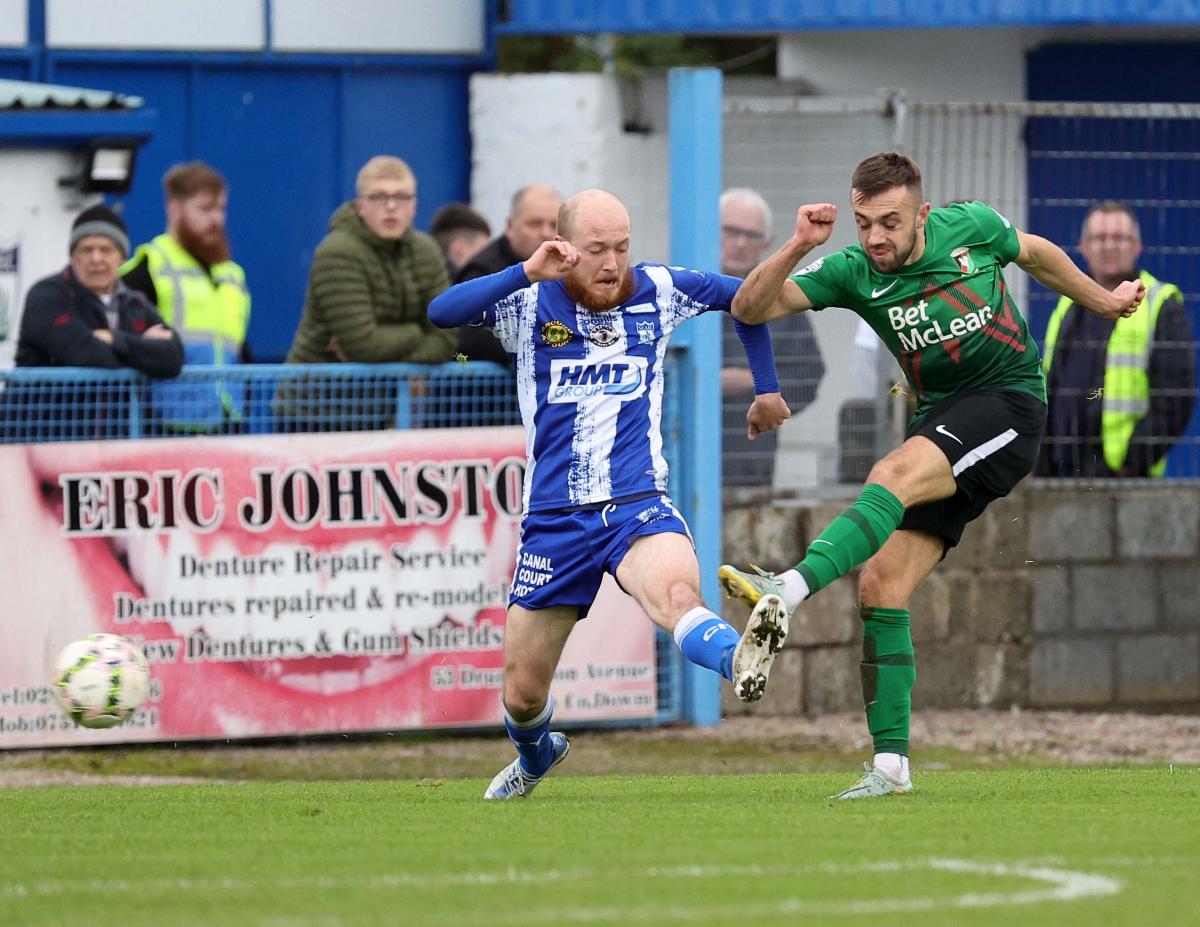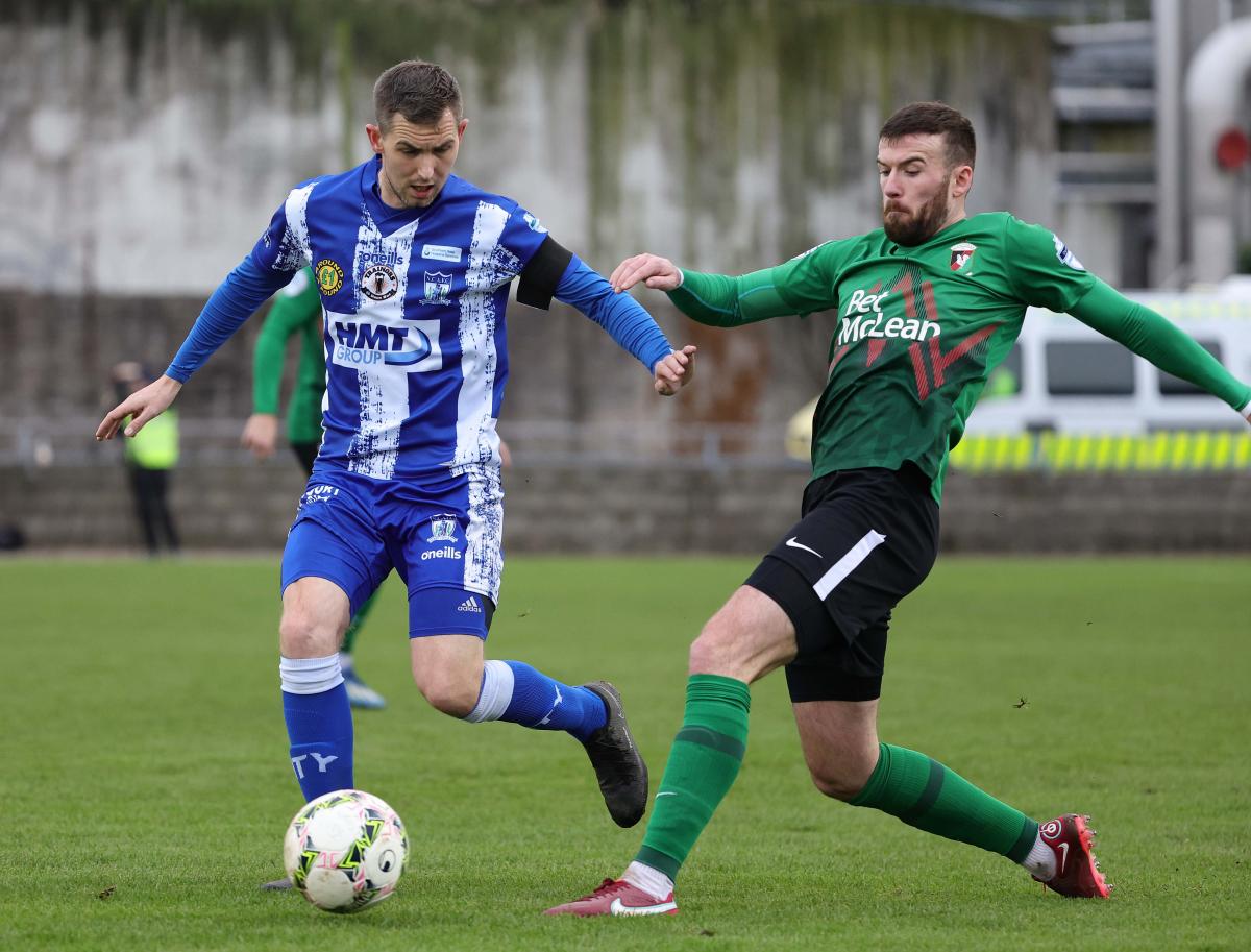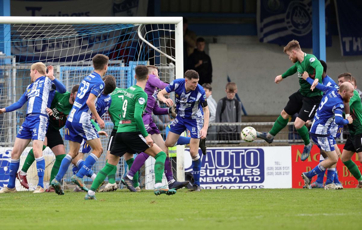 Substitute, James Singleton headed wide from another Hrvoje Plum corner before there was a half chance for City at the other end; Aaron McCarey having to be quick off his line to deny Declan Carville on 77 minutes. There were 5 minutes of added time which almost brought the home side an equaliser on two occasions. On 90 +3 minutes a long ball forward from the Newry keeper was flicked into the path of Daniel Hughes by Declan Carville. Hughes struck the ball well from the edge of the 'D' but Aaron McCarey made a fine stop. The ball broke towards Carville though and he looked certain to level things up until Patrick McClean intervened with a superb interception and clearance.