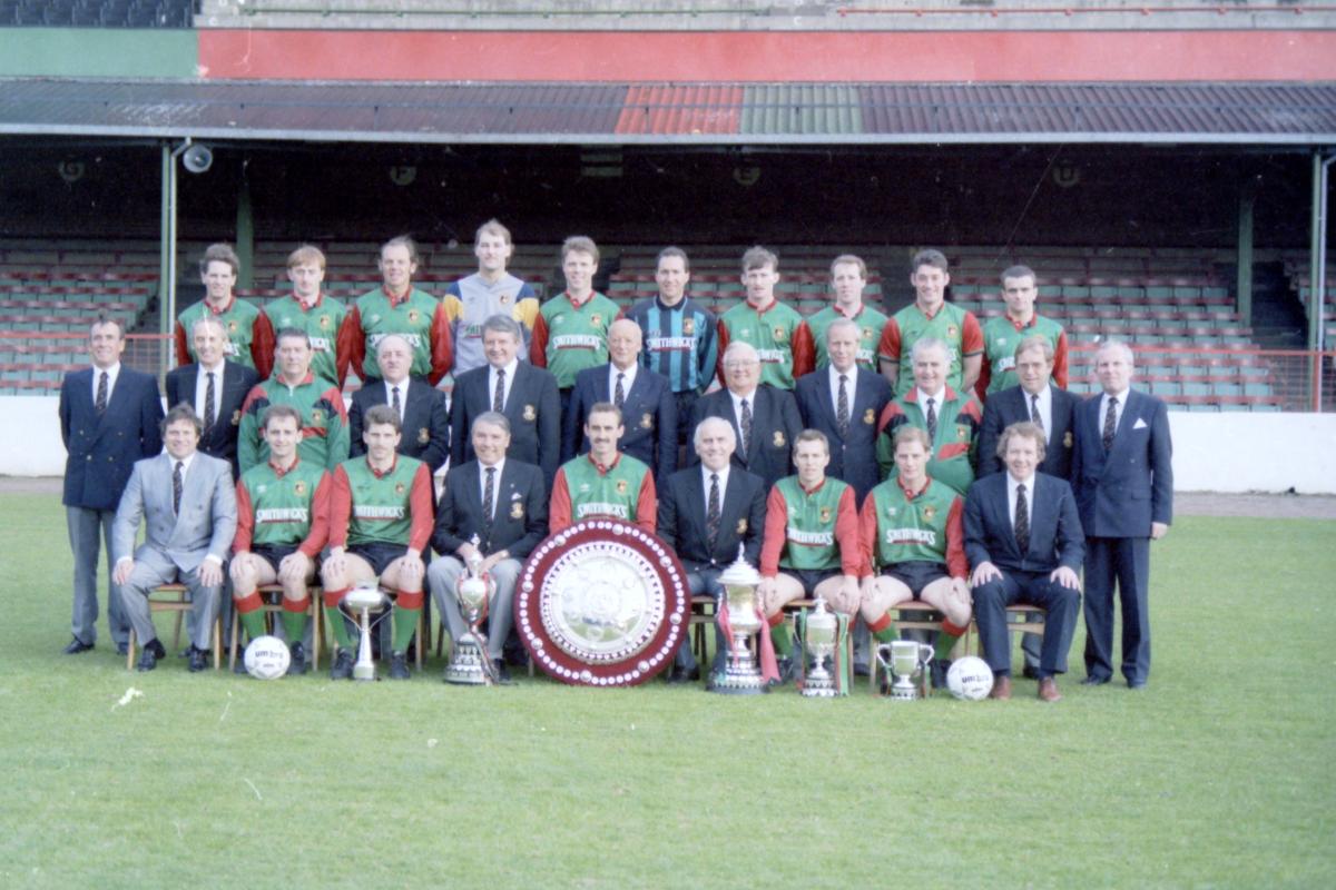 Billy Stephens (fourth left, middle row) with Tommy Jackson's multi trophy winning team of 1989-1990