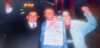 Brian with his son Aaron (right) and Glens player Rory Hamill celebrate a League Championmship victory in the Park Avenue Hotel