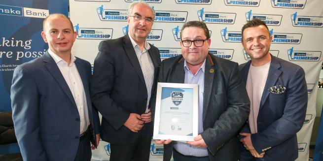 Top photograph: Philip Stevenson is presented with his SuperFan Award by Liam Curran, General Manager, Operations at Danske Bank. Also pictured are Colin Jess, Glentoran Vice Chairman and event host Pete Snodden, Cool FM.
