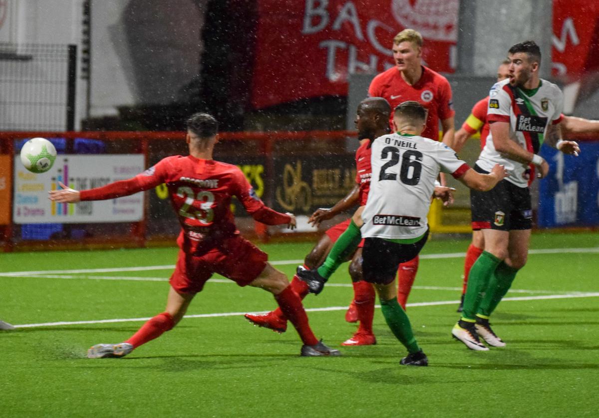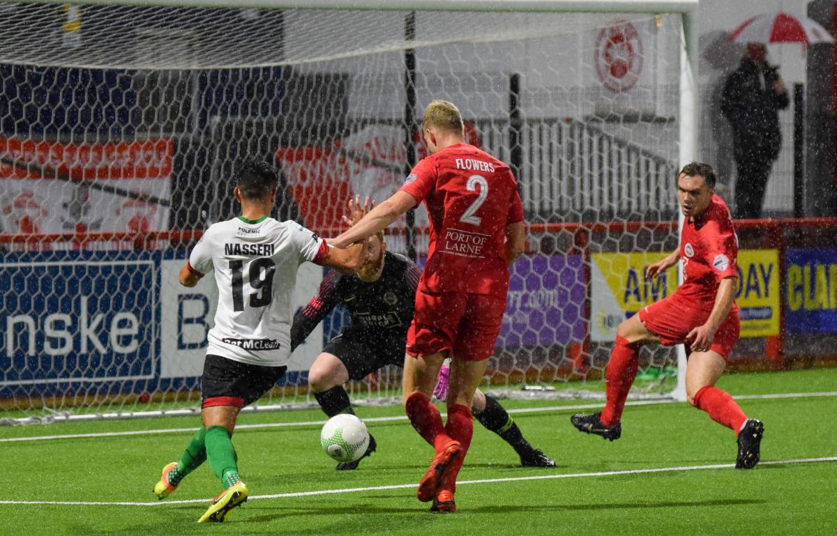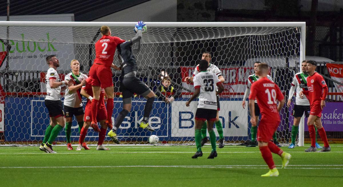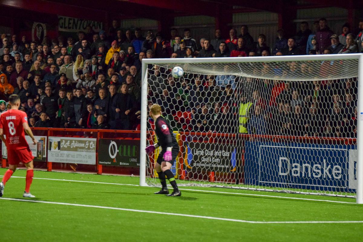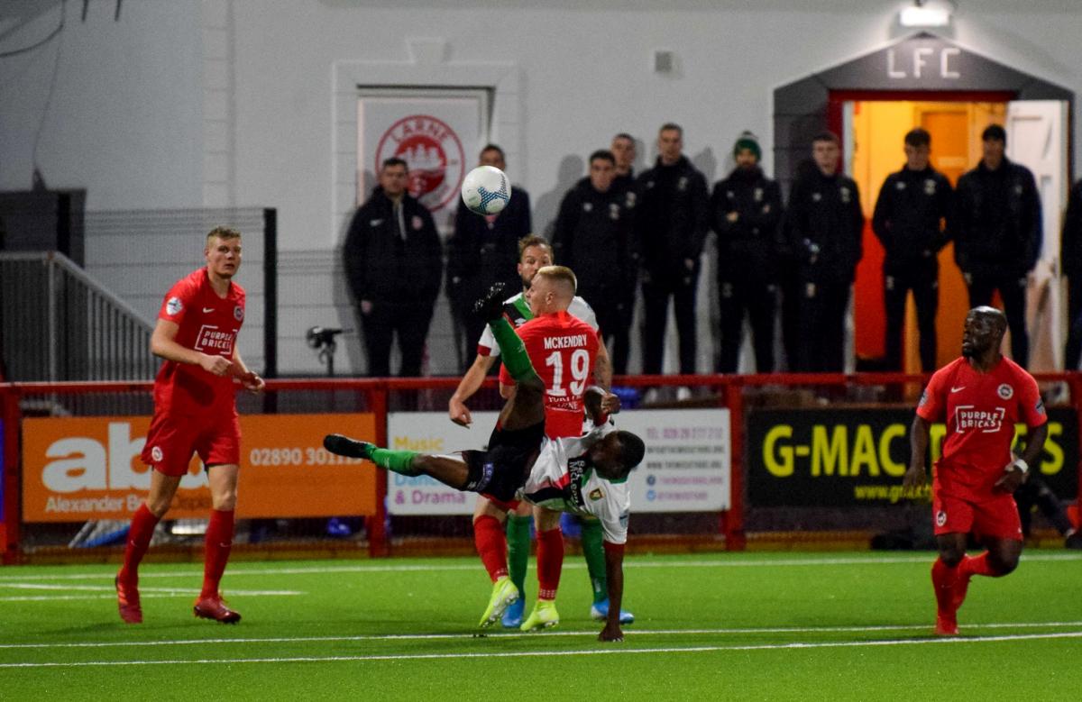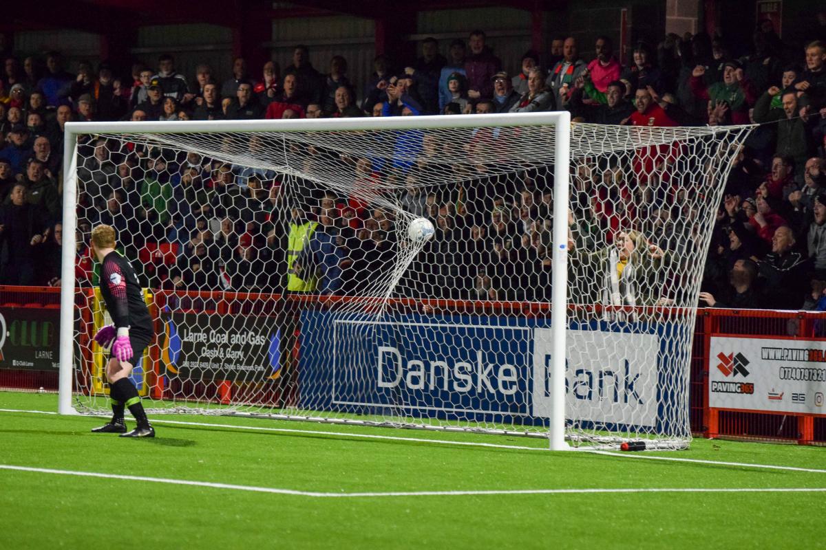 Larne look for a late goal but big Marijan Antolovic won't be beaten.