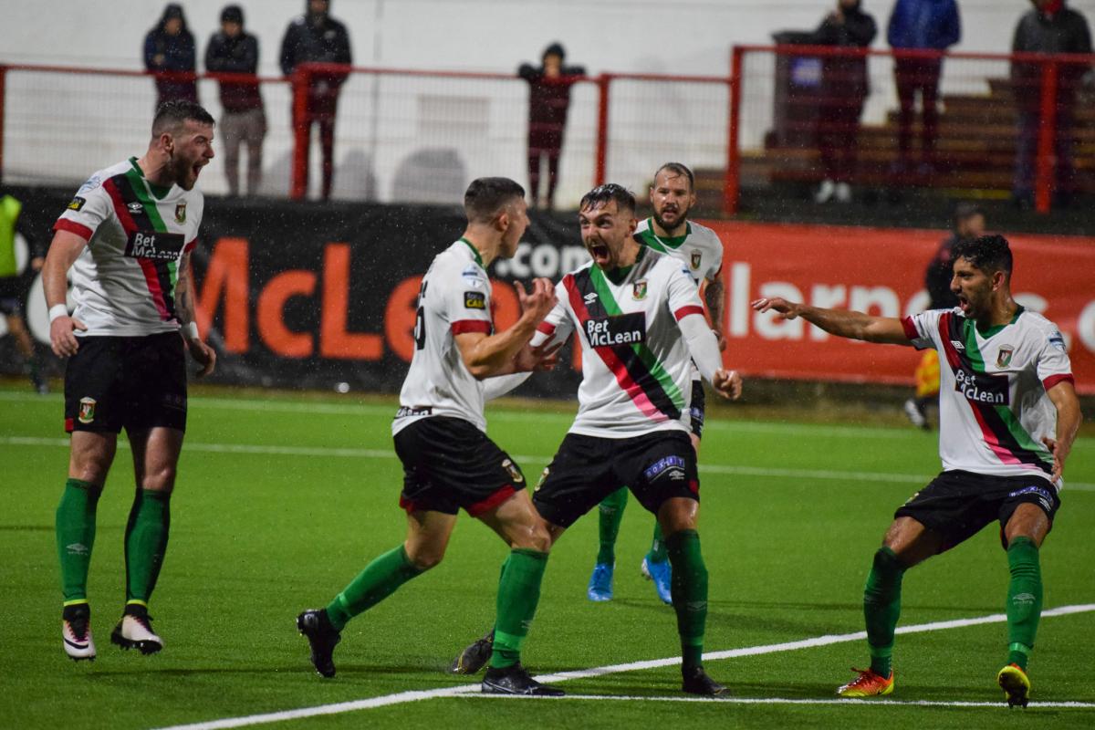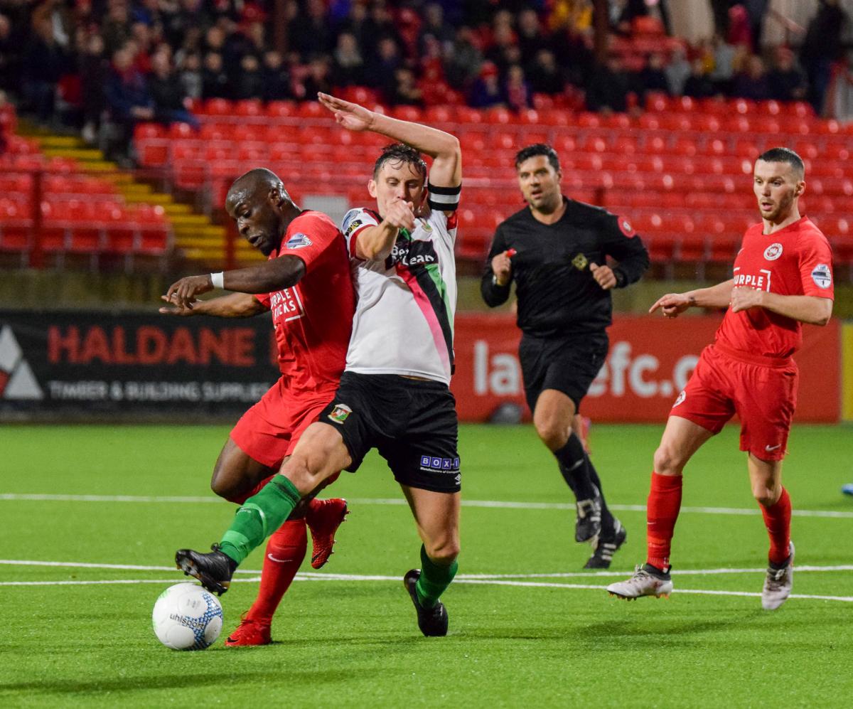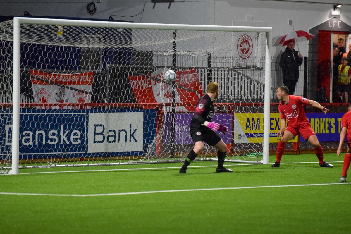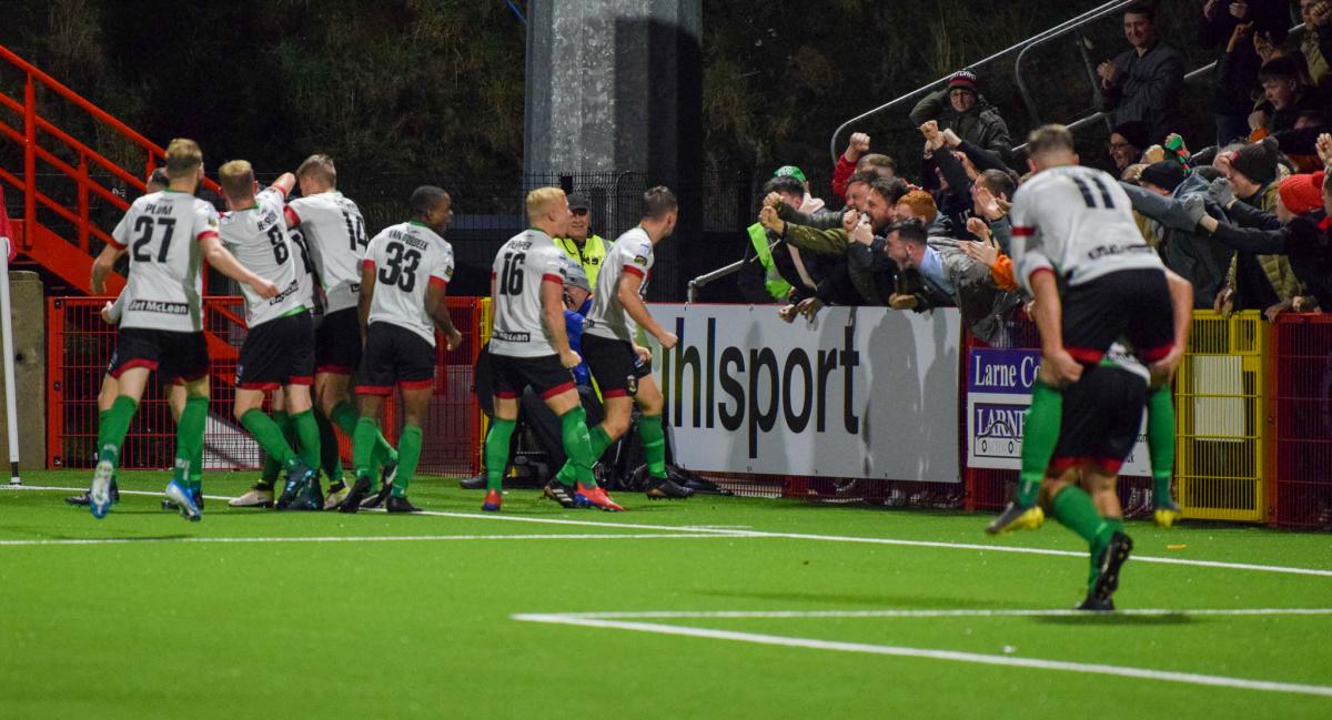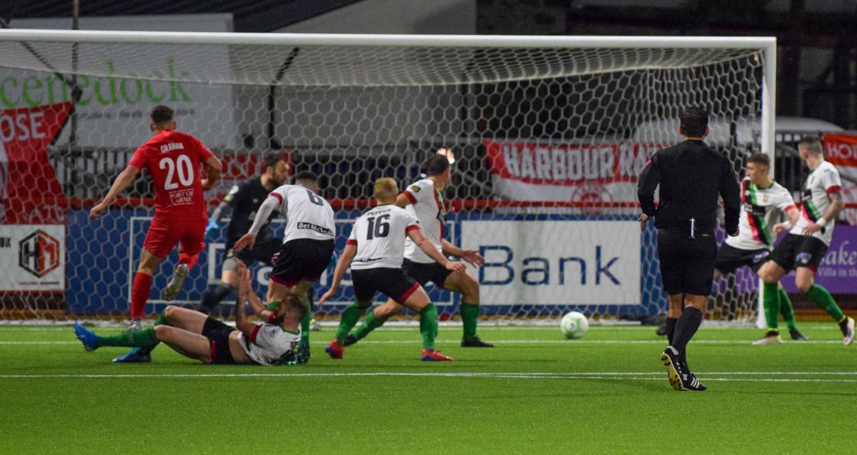 Larne look for a late goal but big Marijan Antolovic won't be beaten.