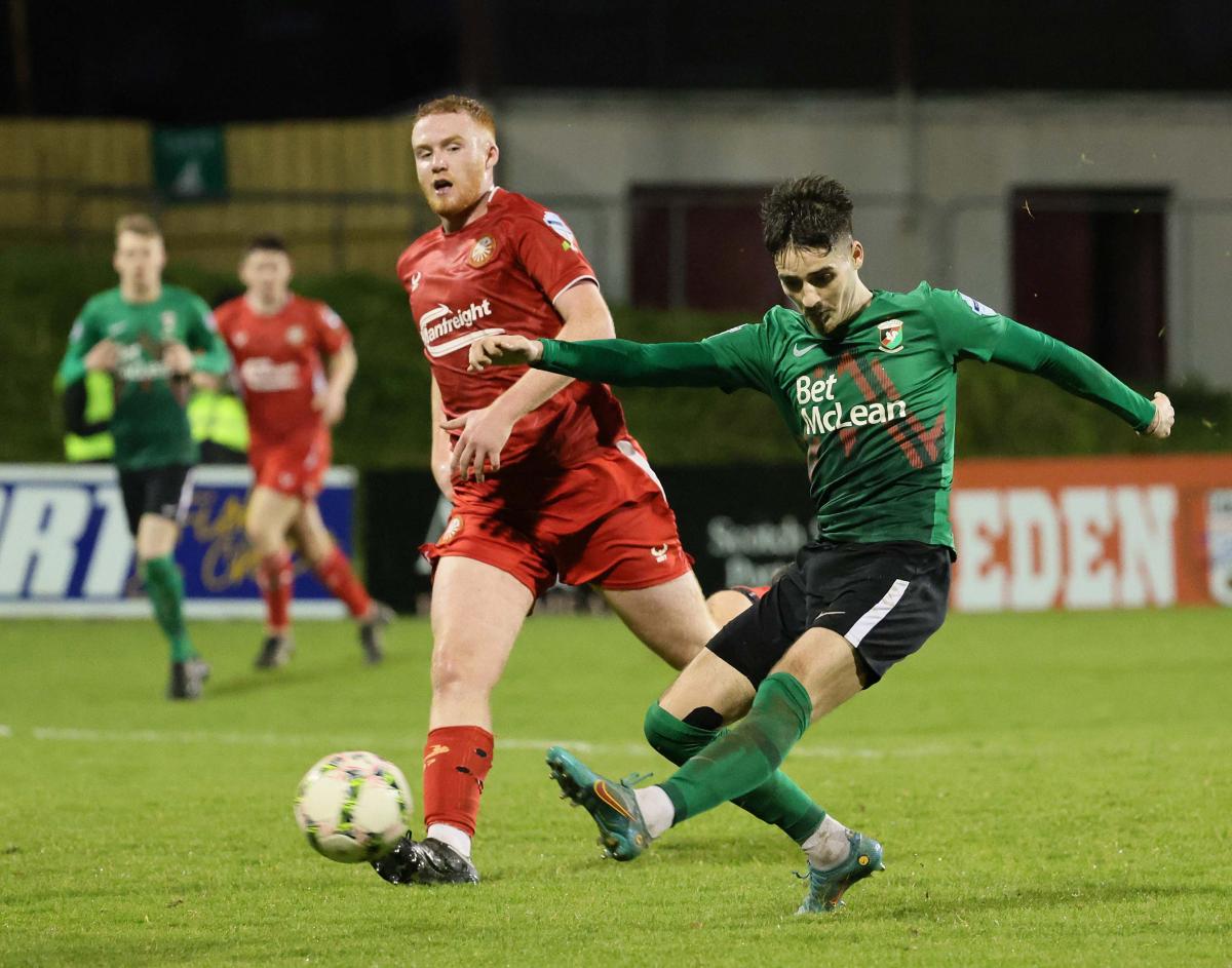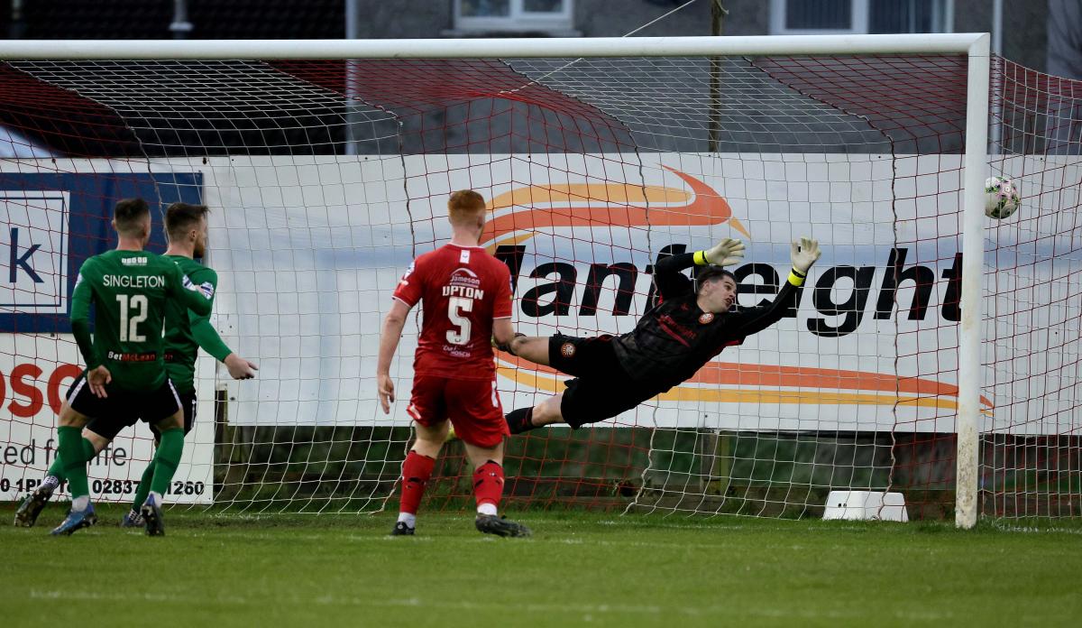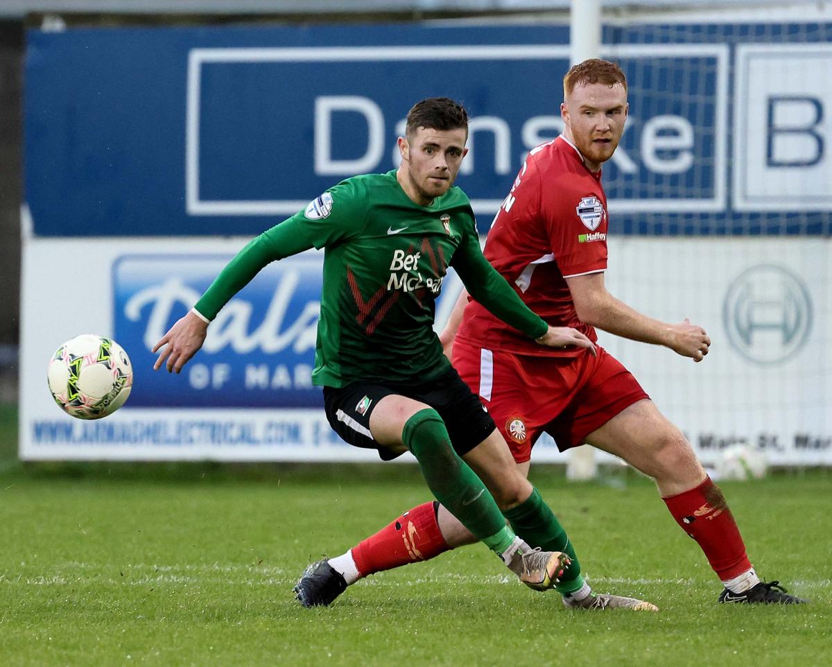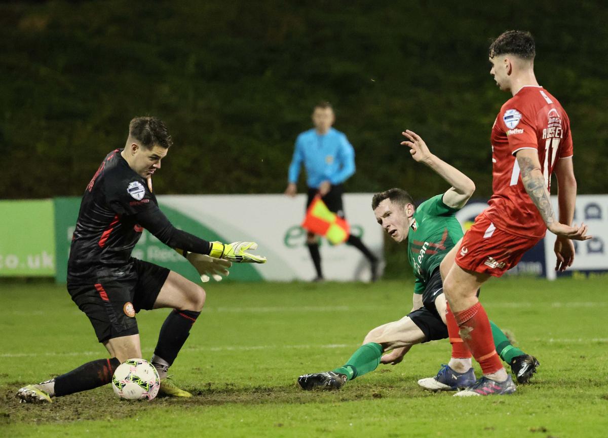 Wet and windy conditions made things difficult at the mid-Ulster venue and both sides struggled to create anything of note. There was a half chance on 6 minutes for Terry Devlin but he shot wide of the target when he could possibly taked another touch or two. On 12 minutes the Glentoran defence failed to clear their lines and Igor Rutkowski's shot looked destined for the bottom corner before Aaron McCarey pulled off an superb save, fingertipping the ball past the post. From the resulting corner the ball was returned to Reece Jordan and as he drove into the area he went over following a challenge by Rhys Marshall. Referee Evan Boyce waved away the home side's penalty appeals.