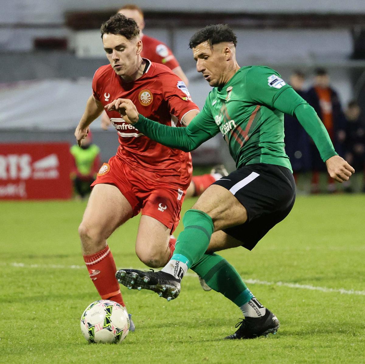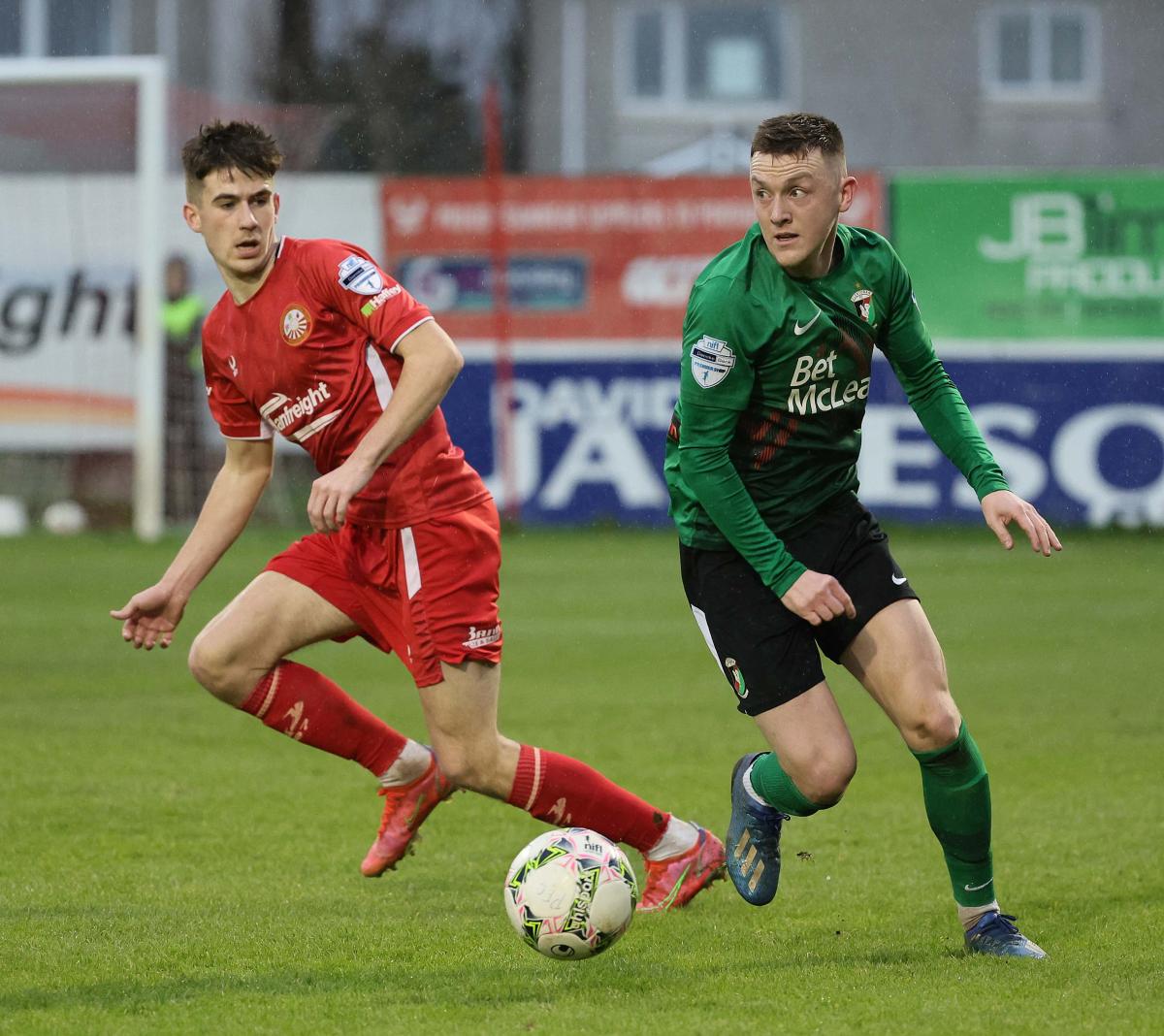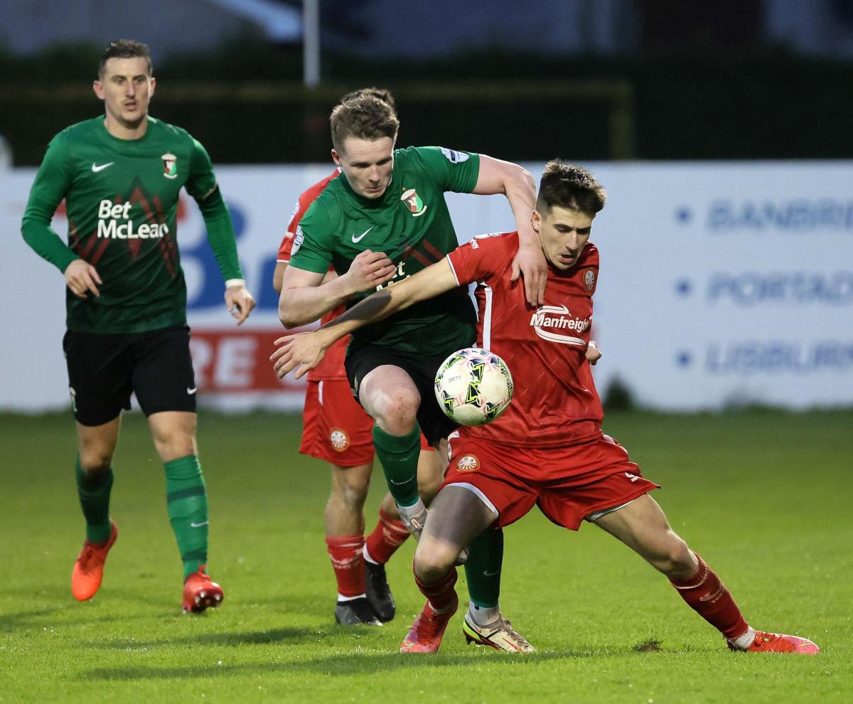 Wet and windy conditions made things difficult at the mid-Ulster venue and both sides struggled to create anything of note. There was a half chance on 6 minutes for Terry Devlin but he shot wide of the target when he could possibly taked another touch or two. On 12 minutes the Glentoran defence failed to clear their lines and Igor Rutkowski's shot looked destined for the bottom corner before Aaron McCarey pulled off an superb save, fingertipping the ball past the post. From the resulting corner the ball was returned to Reece Jordan and as he drove into the area he went over following a challenge by Rhys Marshall. Referee Evan Boyce waved away the home side's penalty appeals.