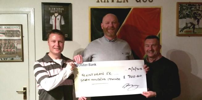 Glentoran Chairman, Stephen Henderson and manager, Eddie Patterson were presented with a cheque for £700 by the Raven Glentoran Supporters Club on Monday evening. They are pictured here with the Raven GSC' Chairman, Dale Mooney.