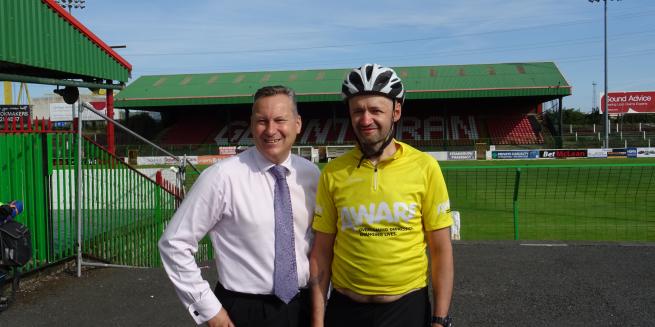 On Wednesday 25th July our commercial manager Simon Wallace met Rodney Leiper at The Oval to welcome him as he reached us on his six day mission cycling to the ground of all 24 clubs in the NIFL premiership and championship in aid of the charity Aware NI.