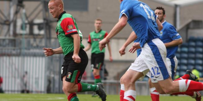 The complexion of the game changed on thirty one minutes. As Linfield prepared to take a throw in Ryan O’Neill went down in his own area, seemingly after an off the ball incident with Aaron Burns. Referee Hunter, or one of his assistants, had spotted the infringement and he issued a straight red card. While Burns was keen to stay and continue the argument there appeared to be few complaints from his colleagues as they ushered him off the pitch. Unfortunately the Glens were unable to capitalise on their numerical advantage and only had a Jimmy Callacher free kick, which was comfortably dealt with by Tuffey, to show for their efforts. Indeed Linfield could well have gone in at half time a goal to the good when Niall Quinn’s free kick brought a great save from Morris in the final minute of the half.