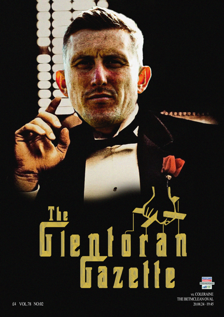 In Tuesday night’s 40-page Glentoran Gazette Declan Devine praises his team – and Glens fans - for their respective performances in Saturday’s match at Portadown. He also reveals he has lost out on a couple of players to clubs outside the league in the last week and that Coleraine boss Dean Shiels ran the rule over Glentoran at Shamrock Park ahead of tonight’s clash. One of the players Declan welcomed back at the weekend, club captain Marcus Kane, takes on the role of the Godfather in Beth Stafford’s new-look cover while programme publishers, the 1923 Committee, queries the ongoing fixture clashes between the male and female Premierships. Norman Ternahan remembers former Glens’ product Roy Essandoh’s unlikely moment of fame while Brian McClelland recalls hard man Billy Whitehurst. Philip Stevenson introduces us to his personal treasure trove of Glens memorabilia while Henry Muldrew casts a disparaging eye on administrators while our team also looks at the future of the NIFL Premiership, a way we could all help the game here raise the badly needed funds to improve facilities and has a round-up of all matters at the Oval. The multi-award-winning Gazette, by the fans for the fans, is £4.