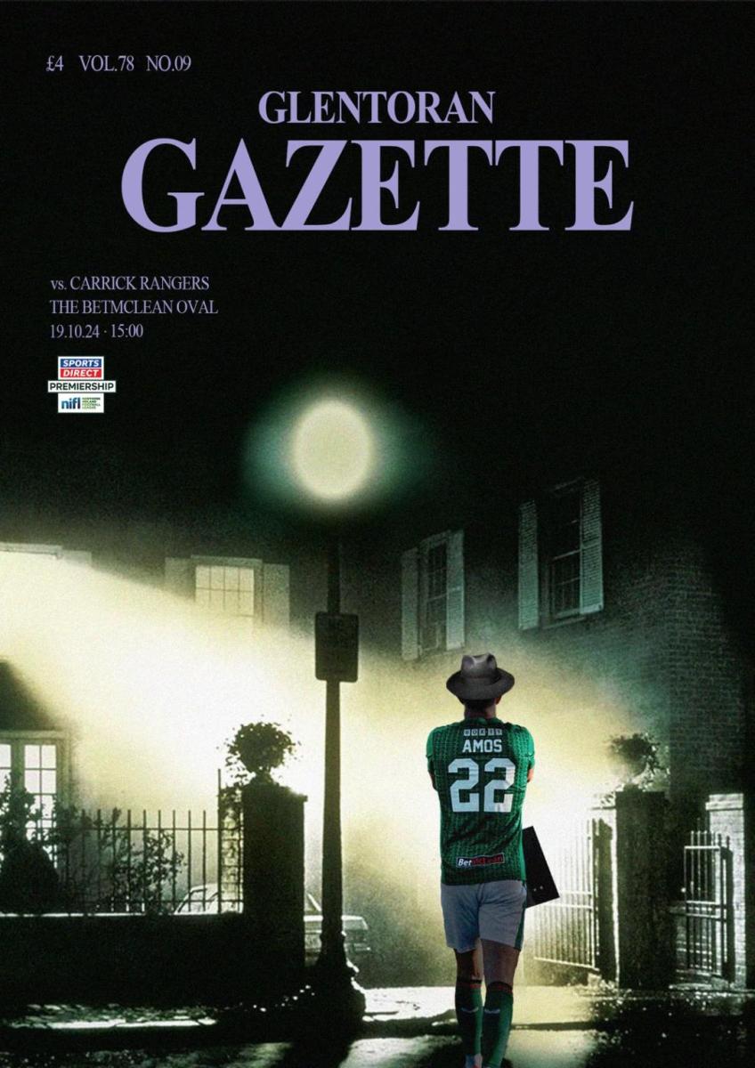 We reckon when Danny Amos signed for the Glens he didn’t think he would star in a poster for The Exorcist. However, he didn’t count on the vision of graphic artist Beth Stafford whose latest fabulous work, which features the former Northern Ireland u21 international, fronts Saturday’s Glentoran Gazette. It’s an edition which acknowledges a new era for Carrick Rangers while Glens manager Declan Devine warns that Stephen Baxter’s side has overcome poor early season form. Declan also praises the efforts of his squad and backroom team, provides an injury update and reveals Aaron Wightman is back in training. Meanwhile, Henry Muldrew queries the fashion for playing out from the back and we look at the changing face of Irish League football. Brian McClelland brings the tale of a doctor who raised pulses at the Oval while Philip Stevenson recalls the FA Cup winner who missed out on an Irish Cup medal and the Vienna Cup triumph in a short spell in east Belfast. We also record the Stormont GSC’s 40th anniversary celebration last Saturday, have news of a new book on Irish League clubs in Europe, report on the Legends raising money for charity and look at the often fragile state of finances in the southern game. And, of course, Norman Ternahan and Tommy Sewell review last weekend’s win in words and pictures. The 40-page Gazette, by the fans for the fans, is £4.