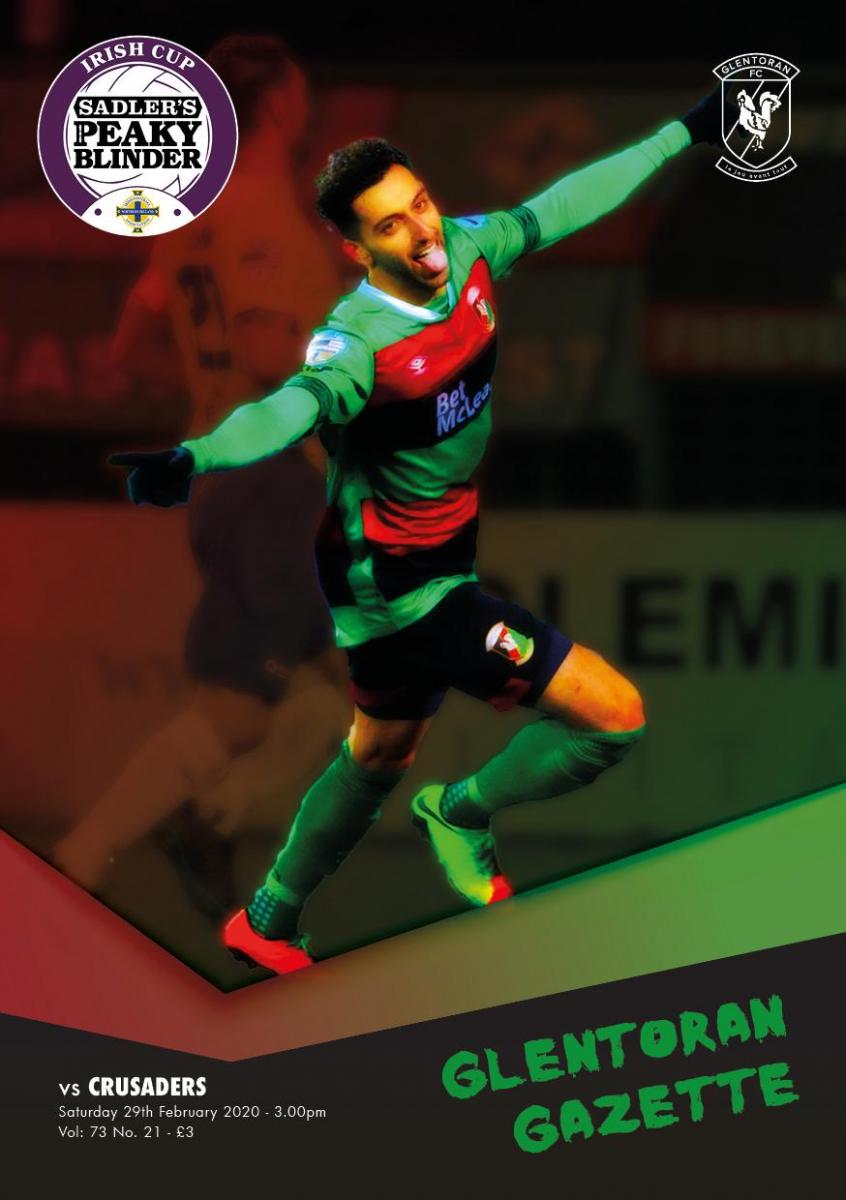 A blast from the past in tomorrow’s Irish Cup edition of the Glentoran Gazette as former editor Paul Vance makes a welcome return to compare his experiences of football in his adopted home of Montreal and here in the Irish League.  To keep the international theme going John Grayden has a look at how things are shaping up south of the border as the new Airtricity League gets underway, as well as interviewing last Saturday’s debutant Seanan Clucas.  Eddy Patrick’s 250 Club feature catches up with Irish Cup winning captain Pete Batey and Brian McClelland looks back at our first ever Irish Cup triumph over a century ago.  Plus Thomas McCartney goes “On The Road” to Taylor’s Avenue in Carrick, top class photo action from Tommy Sewell, a look at our visitors Crusaders, news, views and all the stats.  A big home crowd is expected tomorrow, so make sure you get down early and get them while they last!