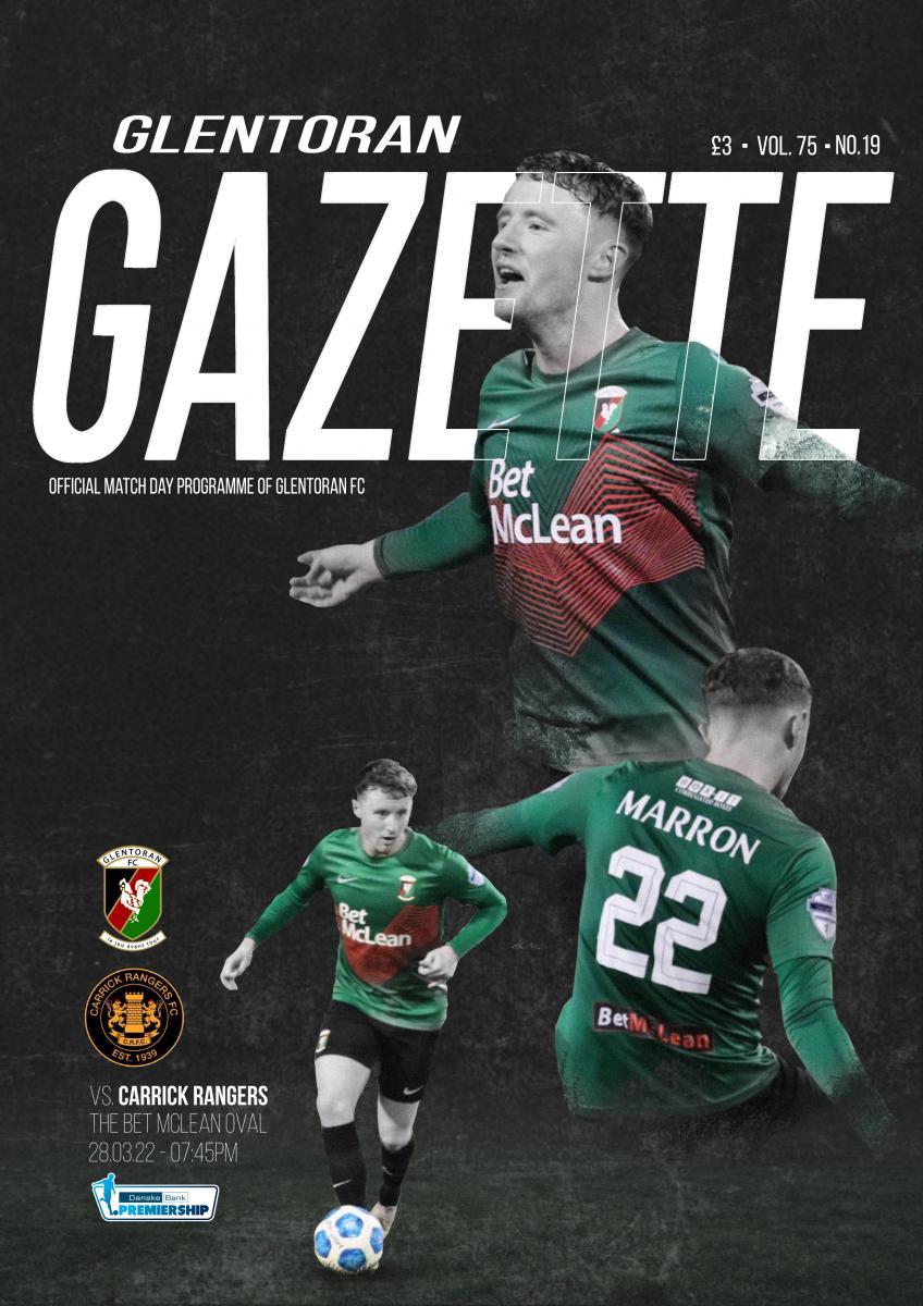 Beth Stafford and Joe Burns’ graphic of the excellent Caolan Marron is the cover of another 40-page Glentoran Gazette in which we highlight Carrick Rangers’ dangermen in Monday night’s crucial Oval clash. Elliott Morris tells Ian Clarke of his retirement as a player while major figures around the Oval past and present pay tribute to the long-standing Club servant. Another legend from that period, Paul Leeman, tells Matthew Brown of the secret role he played in what became known as Morgan Day while the programme publishers, the 1923 Supporters’ Committee, welcome modern-day moves by the NIFL. In the wake of Dillon Powers signing on, Roy Downes recalls Glentoran’s first American-born player while Brian McClelland continues his tale of goal machine James McKnight. Henry Muldrew throws his spotlight on last minute goals by Glentoran and we take a look at how the League of Ireland is shaping up. Norman Ternahan and Thomas Sewell review our latest games in words and pictures and we have a birthday surprise for a young fan. The Gazette, by the fans for the fans, is proving a sell-out at £3.