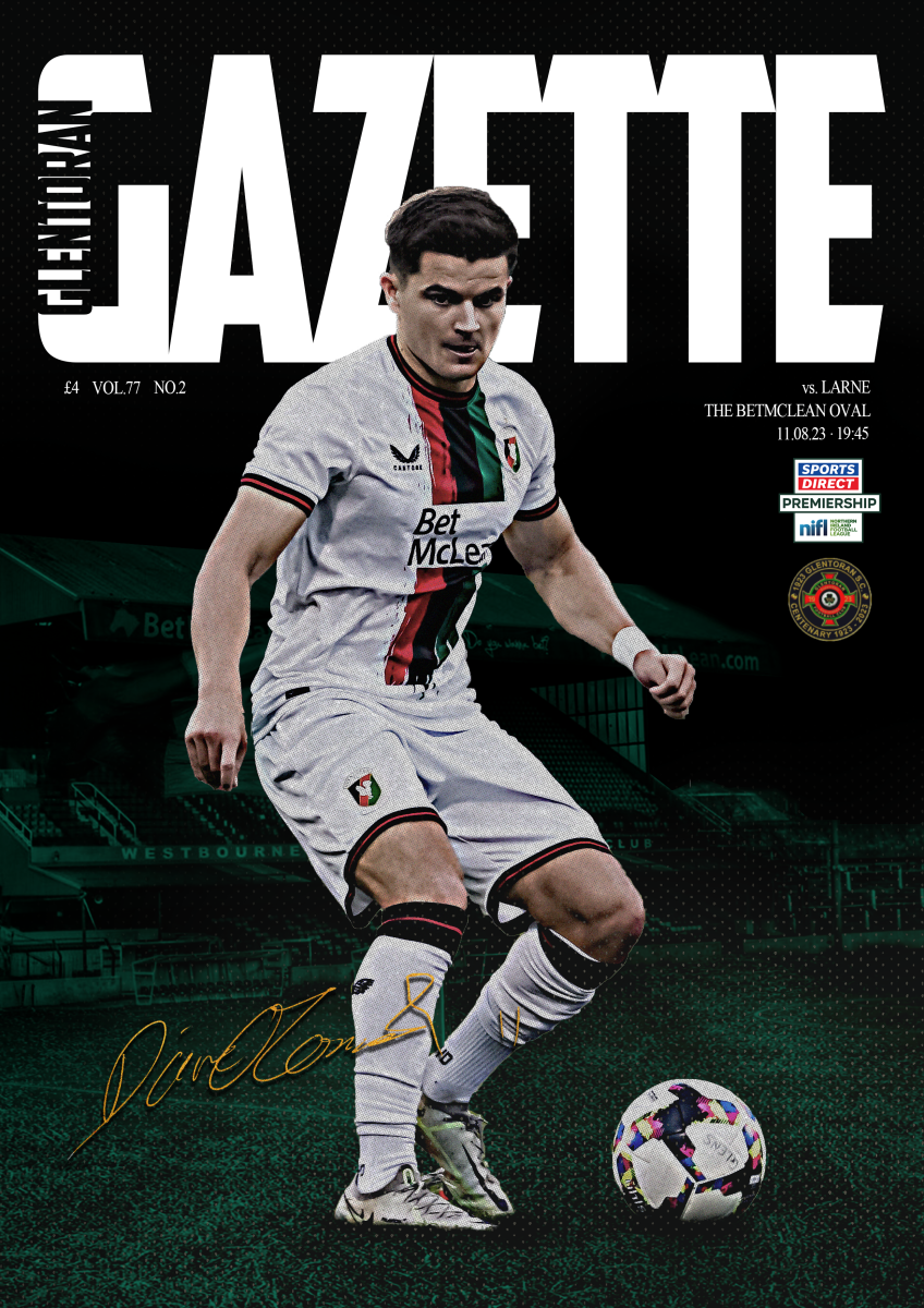 In keeping with all things at the Oval this summer, we have adapted our look slightly for the first programme of the 2023/24 league season. It’s an issue which looks both forward and back and is fronted by the first of Beth Stafford’s new covers featuring Daire O’Connor. Warren Feeney reflects on a battle at Mourneview when he was pleased with the players’ attitude and tenacity but warns that, despite their result on Monday, Larne are reigning champions for a reason. The Gazette team, meanwhile, argue that the start to Larne’s season hasn’t gone to plan. Henry Muldrew appeals for an artistic look for Glentoran around east Belfast, Brian McClelland prelims a slick, short series on the club’s Brylcreem Boys and the 1923 Committee, publishers of the Gazette, reflect on the matchday programme’s continued success. We also look at the outside investment flowing into the Irish game and at how UEFA competitions are creating round-the-year football. Meanwhile, our team take a look at our latest European adventure. Henry looks back at an epic European night at the Oval which will live long in the memory of mentally exhausted fans, Norman Ternahan and Tommy Sewell detail the action in words and pictures and Matthew Brown writes of a magical away day in Malta. We also carry the opening league action in words and pictures.