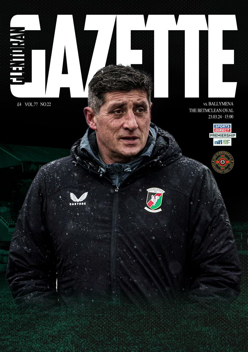 Beth Stafford’s graphic of interim boss Declan Devine fronts Saturday’s 40 page Glentoran Gazette in which 1923 Committee chairman, Jimmy Carter, tells how he started the ball rolling to bring supporters’ groups together while we also document the events since our last home game. Declan, meanwhile, says it is an honour to manage the Glens, promises to work tirelessly in his time here and recalls his time as a player at the Oval. He is not the only old boy returning to the ground today as we welcome members of the 1973/74 European Cup Winners' Cup quarter finalists with Philip Stevenson recounting their famous campaign. Andy Mathieson tells Matthew Brown of plans for our underage groups and argues that British clubs still bag our young talent on the cheap. Brian McClelland inducts another former player into the Brylcreem Boys’ club while Henry Muldrew makes a return to Munich’s Olympic stadium that loomed large in his youth. There is, of course, a match to preview and we look at a Ballymena United squad fighting for their Premiership lives while Declan Devine says we need to be on the front foot from the start of the game like at Dungannon last week. And Norman Ternahan and Tommy Sewell review the first team’s latest games in words and pictures. The Gazette, by the fans for the fans, is £4.