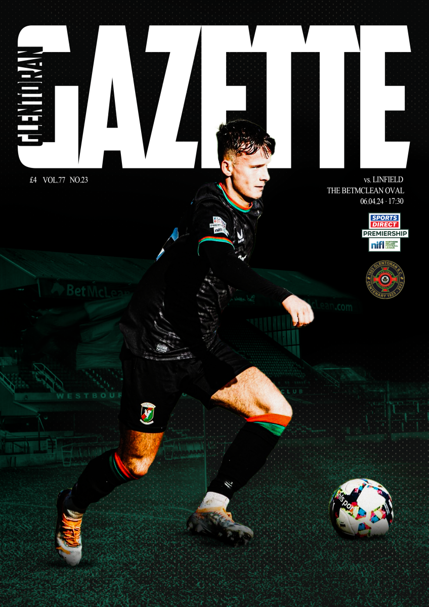 Recent debutant Theo McToal is Beth Stafford’s Gazette cover star for tomorrow’s second meeting with Big Two rivals Linfield within eight days.  Manager Declan Devine calls for a much more positive approach this time out and welcomes David Fisher and Seanan Clucas back to the squad.  Appropriately for this Big Two clash Roy Downes recalls a trip across the city on the 60th anniversary of one of our most stunning victories while Henry Muldrew has a look at derbies worldwide.  In fact it’s double Muldrew this week as he also takes us back to the Seventies and his teenage obsession with Argentina…and Olivia Newton-John.  The 1923 Committee bemoan the disjointed end to the pre-split fixtures, John Grayden looks at the race for promotion from the Championship and William James has a look at how things are shaping up south of the border.  We cover the return to the Oval of members of the famous European Cup Winners’ Cup quarter final side of 1974 at our last Premiership game, Brian McClelland has the second part of the story of his latest Brylcreem Boy, Paddy McCann, and of course Norman Ternahan and Tommy Sewell dissect all the latest on the pitch in words and pictures.  Plus This Week Then, news from around the Oval and all the stats.  Your multi-award winning Glentoran Gazette, by the fans and for the fans, is just £4.