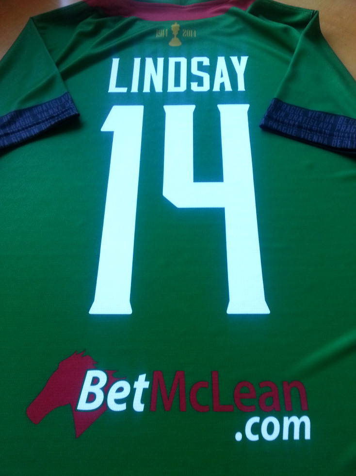 The recent photo shoot for the Vienna Cup Shirts had Elliott Morris and Kym Nelson modelling. Elliott wore the keeper’s jersey with “Morris” on the back, whilst Kym wore the green outfield strip (pictured). The name on the back of Kym’s shirt was “Lindsay”, and it carries the number 14.