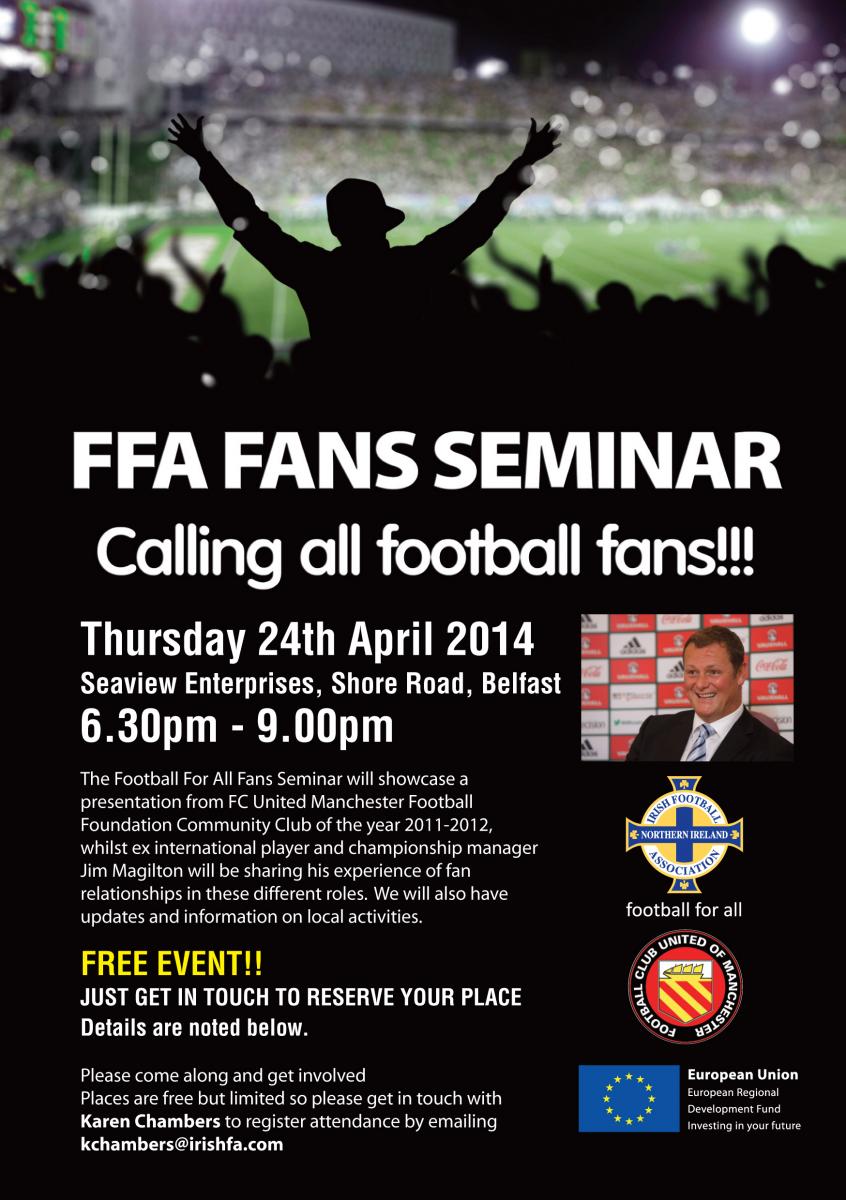 The Irish FA are hosting a Football For ALL Fans Seminar at Seaview on Thursday. It's free for fans of all clubs so if you want to go along please email Karen Chambers kchambers@irishfa.com