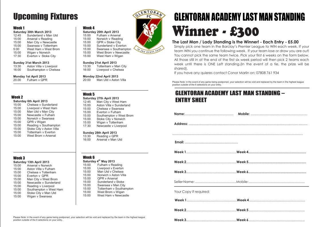 Also the Academy have introduced a 'Last Man Standing' game as shown in the above form. The rules are simple and all explained above. It costs £5 per ticket and once again they are available to purchase today at the Milk Bar.
